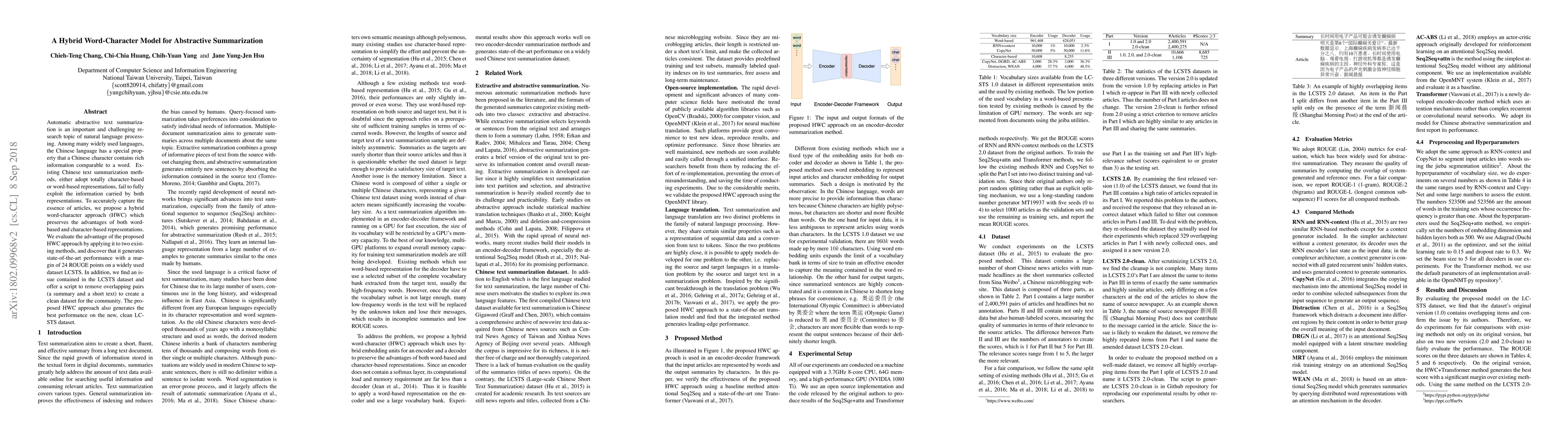 This paper proposes a hybrid word-character approach (HWC) for abstractive Chinese text summarization, combining the strengths of word-based and character-based representations to achieve state-of-the-art performance, and also addresses issues in the LCSTS dataset by providing a script to remove overlapping pairs.