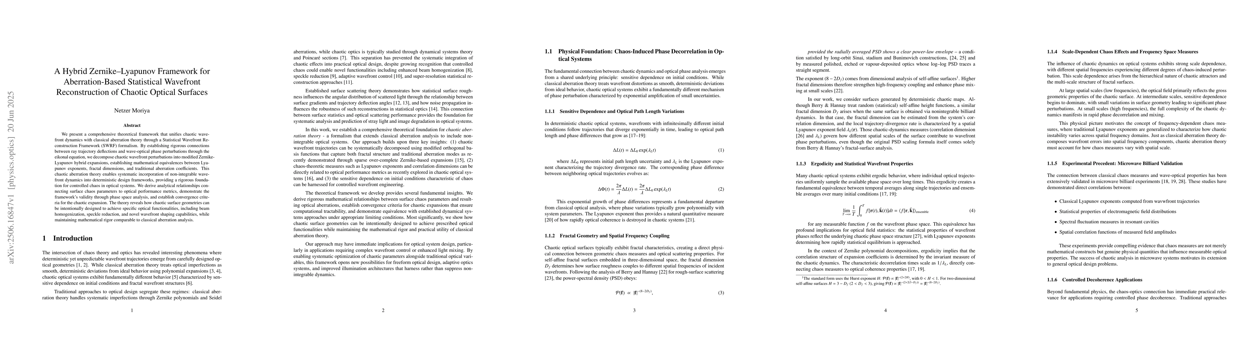 We present a comprehensive theoretical framework that unifies chaotic wavefront dynamics with classical aberration theory through a Statistical Wavefront Reconstruction Framework (SWRF) formalism. By establishing rigorous connections between ray trajectory deflections and wave-optical phase perturbations through the eikonal equation, we decompose chaotic wavefront perturbations into modified Zernike-Lyapunov hybrid expansions, establishing mathematical equivalences between Lyapunov exponents, fractal dimensions, and traditional aberration coefficients. This chaotic aberration theory enables systematic incorporation of non-integrable wavefront dynamics into deterministic design frameworks, providing a rigorous foundation for controlled chaos in optical systems. We derive analytical relationships connecting surface chaos parameters to optical performance metrics, demonstrate the framework's validity through phase space analysis, and establish convergence criteria for the chaotic expansion. The theory reveals how chaotic surface geometries can be intentionally designed to achieve specific optical functionalities, including beam homogenization, speckle reduction, and novel wavefront shaping capabilities, while maintaining mathematical rigor comparable to classical aberration analysis.