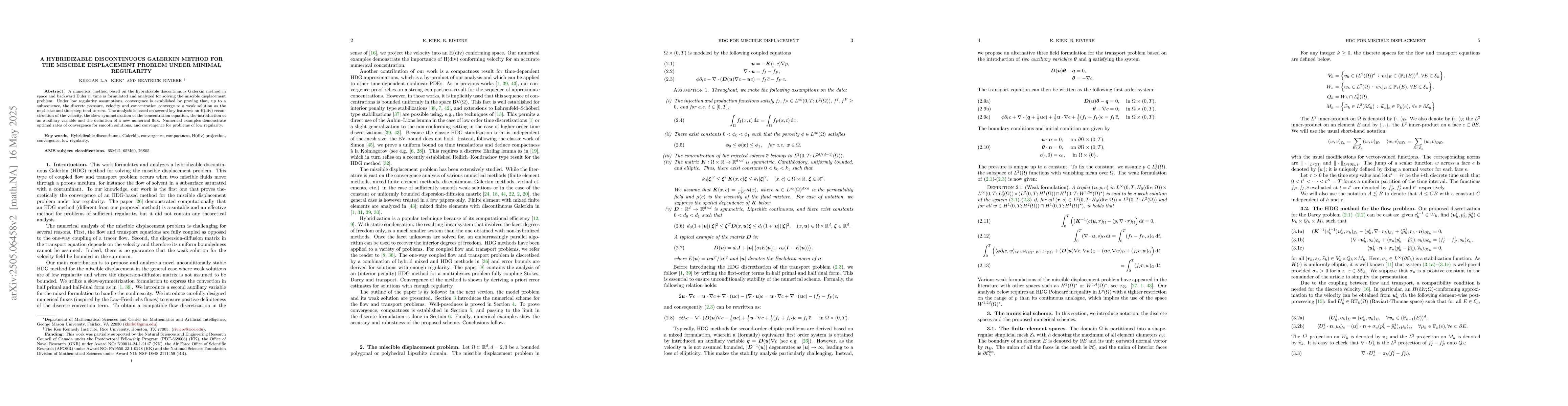 This research contributes to the numerical solution of the miscible displacement problem under minimal regularity assumptions, which is crucial for practical applications in reservoir simulation and geosciences.