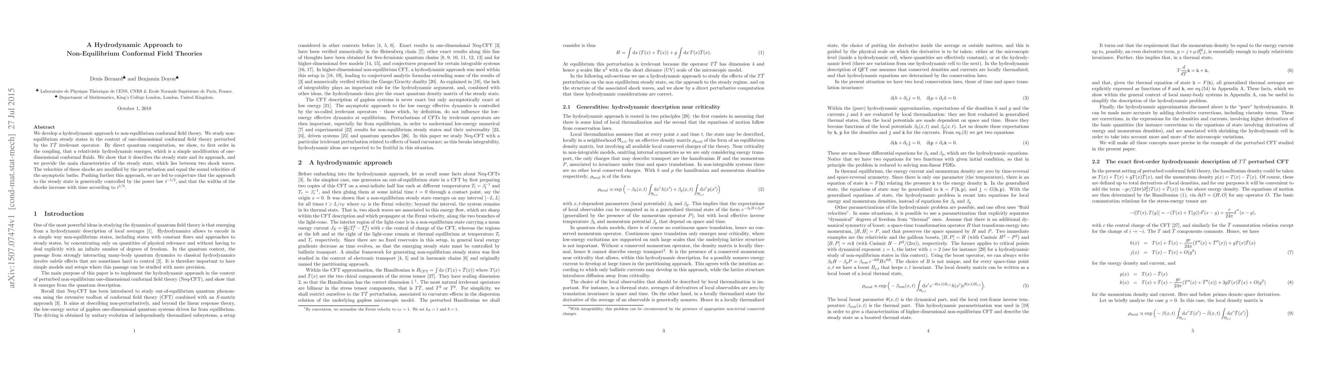 This paper develops a hydrodynamic framework for non-equilibrium conformal field theories, demonstrating that a relativistic hydrodynamic emerges in one-dimensional systems perturbed by the $T\bar T$ operator, describing the steady state and its evolution between shock waves. The approach suggests a $t^{-1/2}$ power law for the approach to steady state and $t^{1/3}$ growth for shock widths.