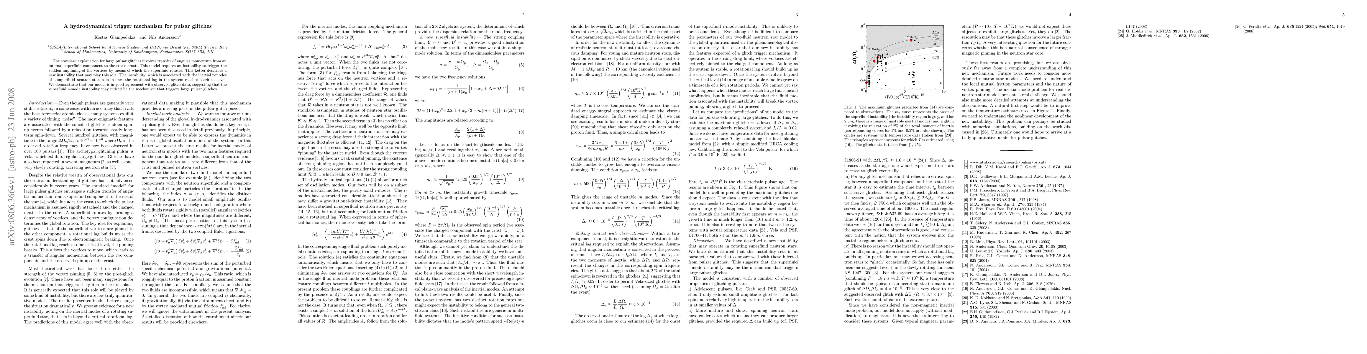 This paper proposes a new hydrodynamical trigger mechanism for pulsar glitches, suggesting that an instability in superfluid r-modes of a neutron star, activated at a critical rotational lag, may cause the sudden unpinning of vortices, aligning well with observed glitch data.