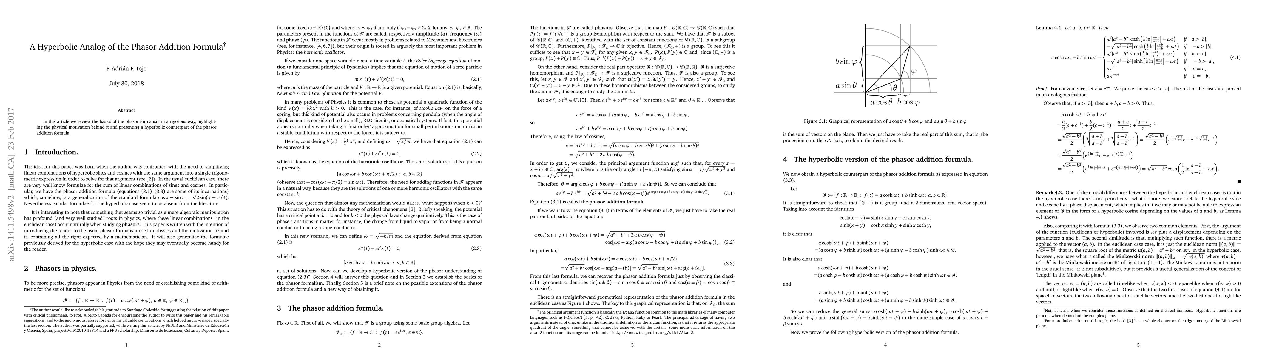 In this article we review the basics of the phasor formalism in a rigorous way, highlighting the physical motivation behind it and presenting a hyperbolic counterpart of the phasor addition formula.