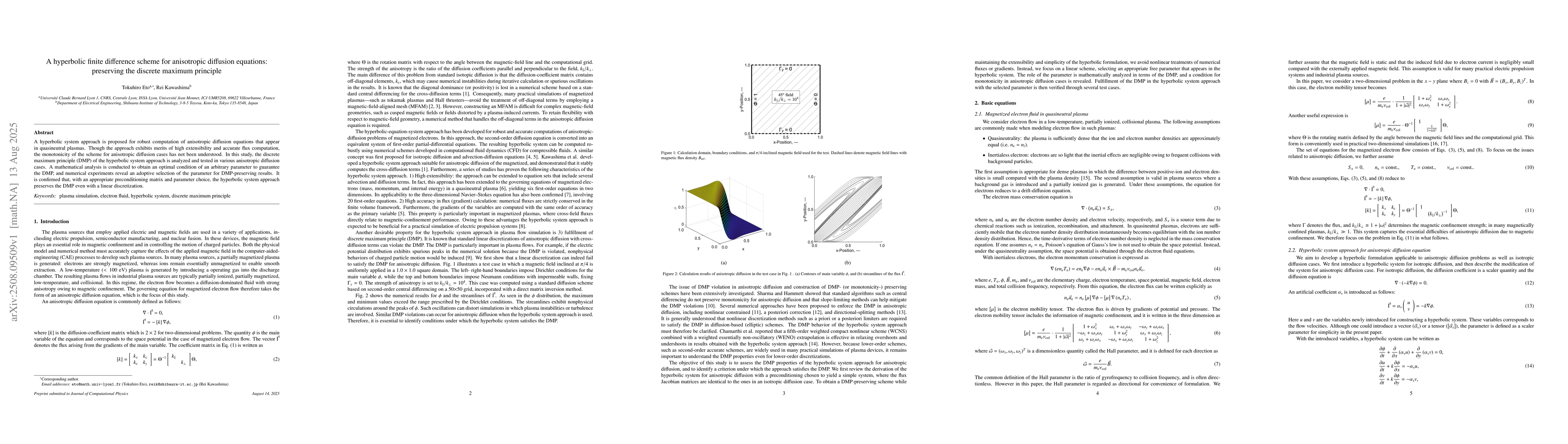 A hyperbolic system approach is proposed for robust computation of anisotropic diffusion equations that appear in quasineutral plasmas. Though the approach exhibits merits of high extensibility and accurate flux computation, the monotonicity of the scheme for anisotropic diffusion cases has not been understood. In this study, the discrete maximum principle (DMP) of the hyperbolic system approach is analyzed and tested in various anisotropic diffusion cases. A mathematical analysis is conducted to obtain an optimal condition of an arbitrary parameter to guarantee the DMP, and numerical experiments reveal an adoptive selection of the parameter for DMP-preserving results. It is confirmed that, with an appropriate preconditioning matrix and parameter choice, the hyperbolic system approach preserves the DMP even with a linear discretization.