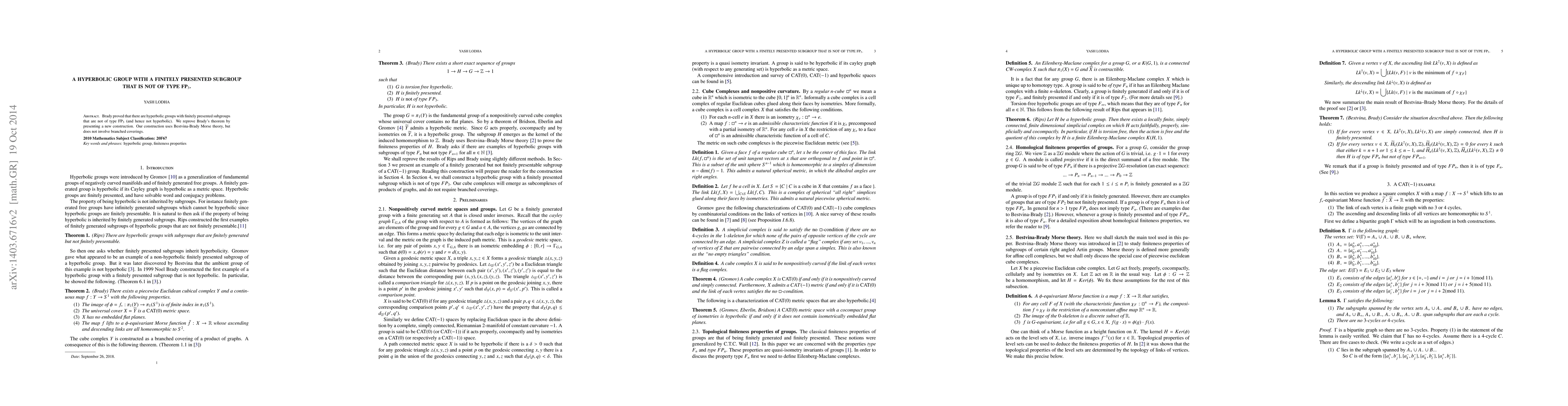Brady proved that there are hyperbolic groups with finitely presented subgroups that are not of type $FP_3$ (and hence not hyperbolic). We reprove Brady's theorem by presenting a new construction. Our construction uses Bestvina-Brady Morse theory, but does not involve branched coverings.