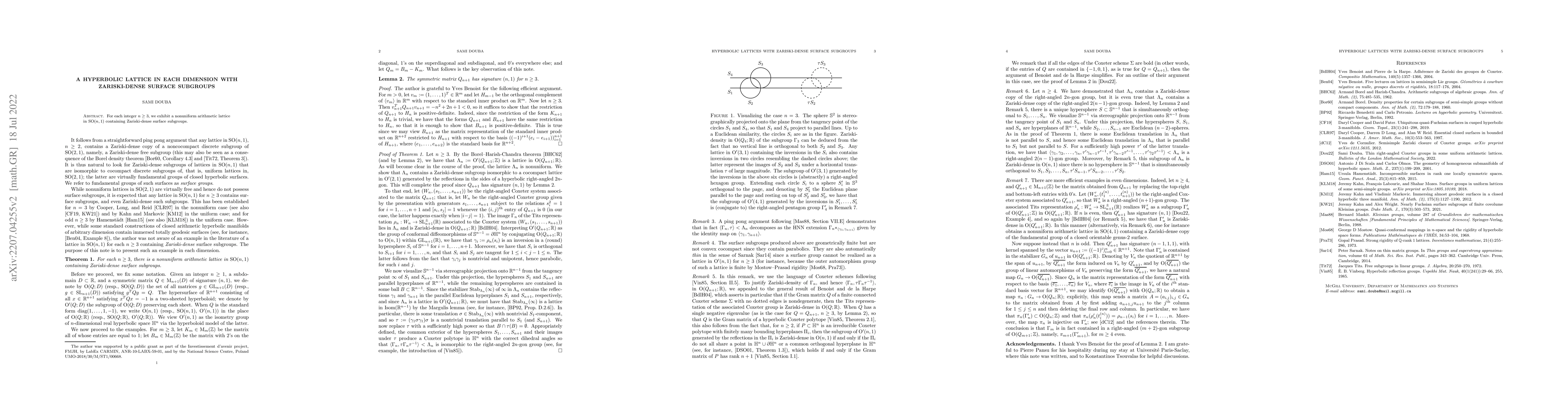 Summary: The paper constructs a nonuniform arithmetic lattice in $\mathrm{SO}(n,1)$ for each dimension $n \geq 3$, demonstrating that it contains Zariski-dense surface subgroups. This provides insight into the structure of hyperbolic lattices in higher dimensions.