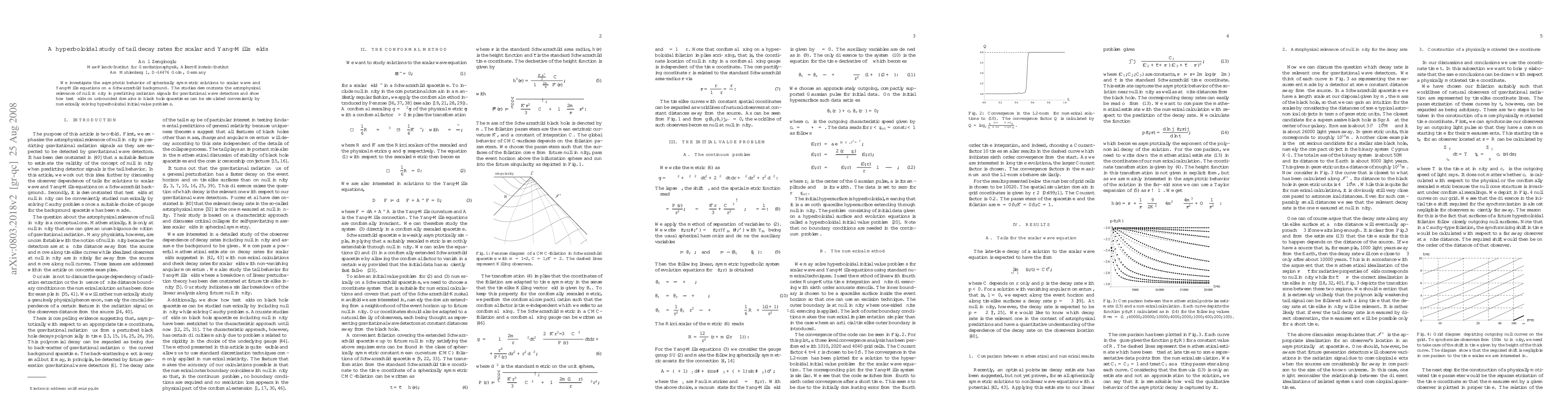 This paper examines the tail decay rates of scalar and Yang-Mills fields in Schwarzschild spacetimes, focusing on their asymptotic behavior. It highlights the significance of null infinity in predicting radiation signals for gravitational wave detectors and demonstrates the utility of hyperboloidal initial value problems in simulating test fields.