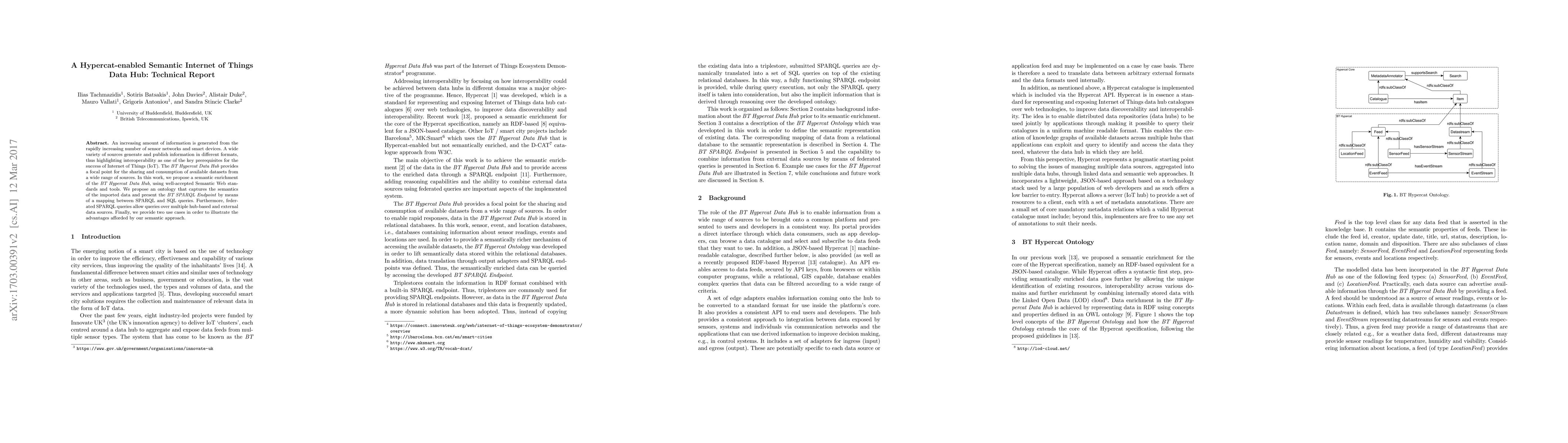 An increasing amount of information is generated from the rapidly increasing number of sensor networks and smart devices. A wide variety of sources generate and publish information in different formats, thus highlighting interoperability as one of the key prerequisites for the success of Internet of Things (IoT). The BT Hypercat Data Hub provides a focal point for the sharing and consumption of available datasets from a wide range of sources. In this work, we propose a semantic enrichment of the BT Hypercat Data Hub, using well-accepted Semantic Web standards and tools. We propose an ontology that captures the semantics of the imported data and present the BT SPARQL Endpoint by means of a mapping between SPARQL and SQL queries. Furthermore, federated SPARQL queries allow queries over multiple hub-based and external data sources. Finally, we provide two use cases in order to illustrate the advantages afforded by our semantic approach.