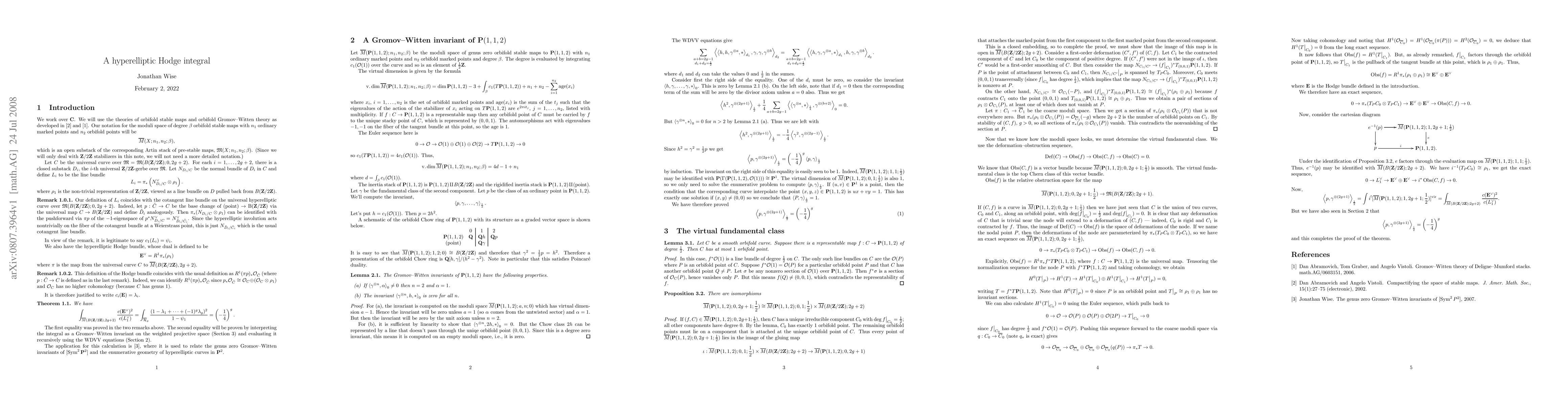 We calculate the hyperelliptic Hodge integral lambda_g lambda_{g-1} / (1 - psi) for use in arXiv:math/0702219. The proof uses the WDVV equations for the genus zero Gromov--Witten invariants of P(1,1,2).