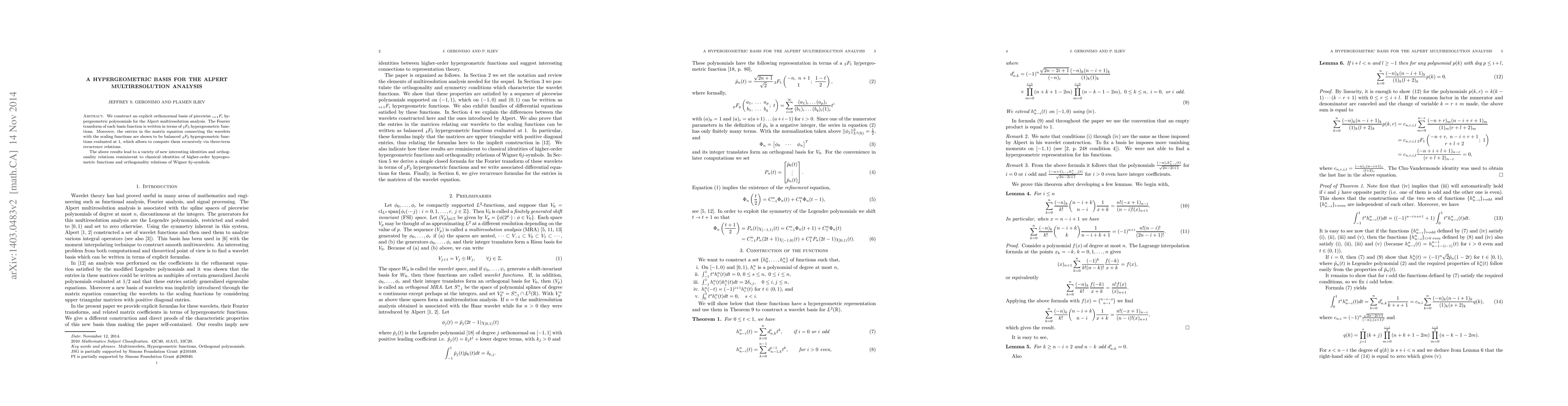 This research constructs an explicit orthonormal basis of hypergeometric polynomials for the Alpert multiresolution analysis, expressing Fourier transforms in terms of ${}_2F_3$ functions. It also reveals that matrix entries connecting wavelets and scaling functions are balanced ${}_4 F_3$ functions, computable via three-term recurrence relations, leading to new hypergeometric and orthogonality identities.