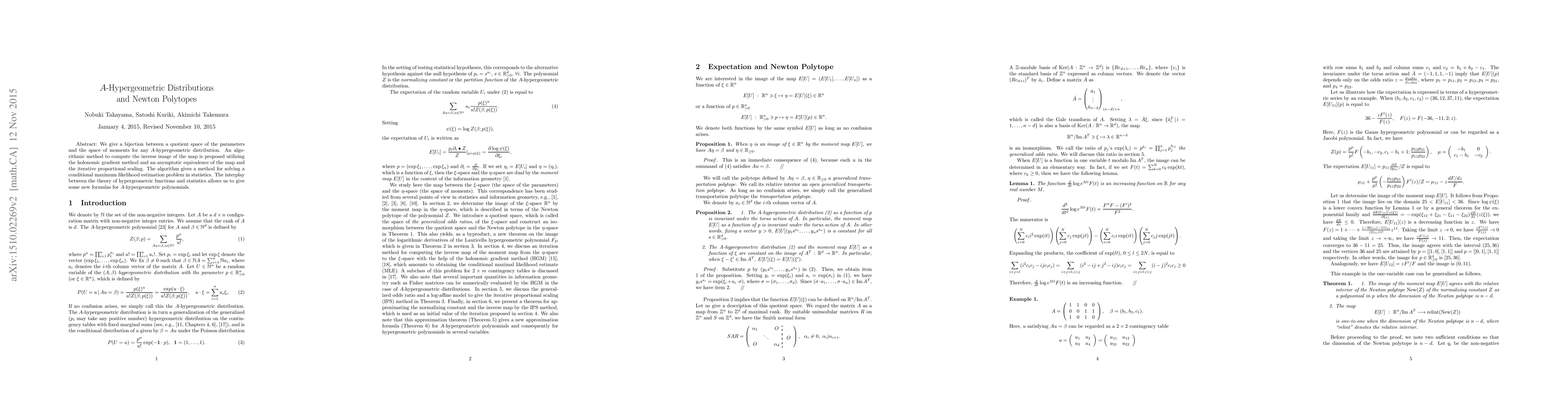 We give a bijection between a quotient space of the parameters and the space of moments for any $A$-hypergeometric distribution. An algorithmic method to compute the inverse image of the map is proposed utilizing the holonomic gradient method and an asymptotic equivalence of the map and the iterative proportional scaling. The algorithm gives a method to solve a conditional maximum likelihood estimation problem in statistics. Our interplay between the theory of hypergeometric functions and statistics gives some new formulas of $A$-hypergeometric polynomials.