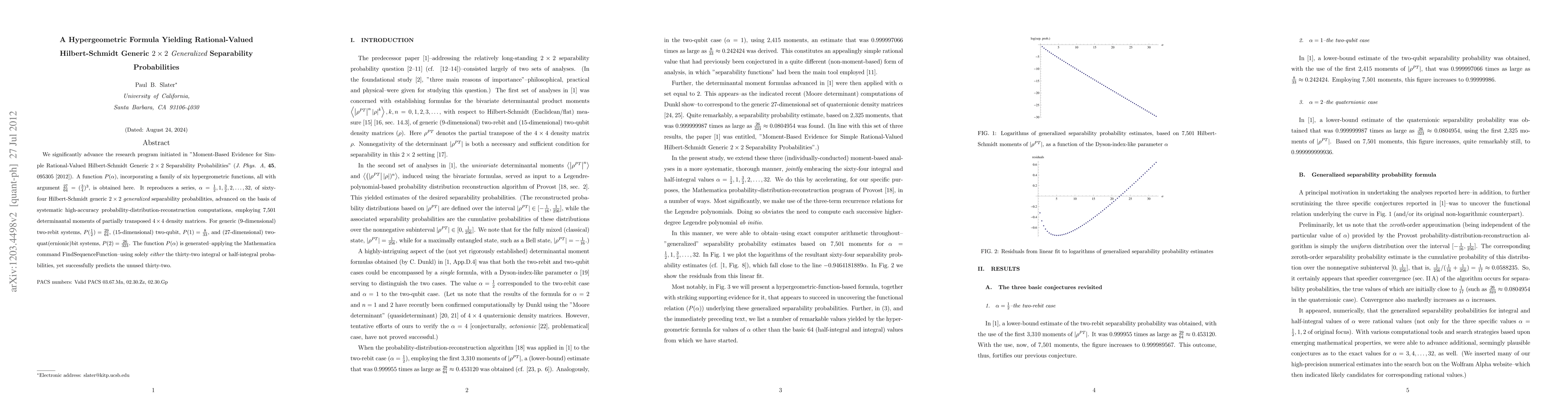 This paper develops a hypergeometric function P(alpha) that generates Hilbert-Schmidt generic 2 x 2 generalized separability probabilities for various quantum systems. It successfully predicts sixty-four separability probabilities using only thirty-two known values, demonstrating high accuracy through extensive computational methods.