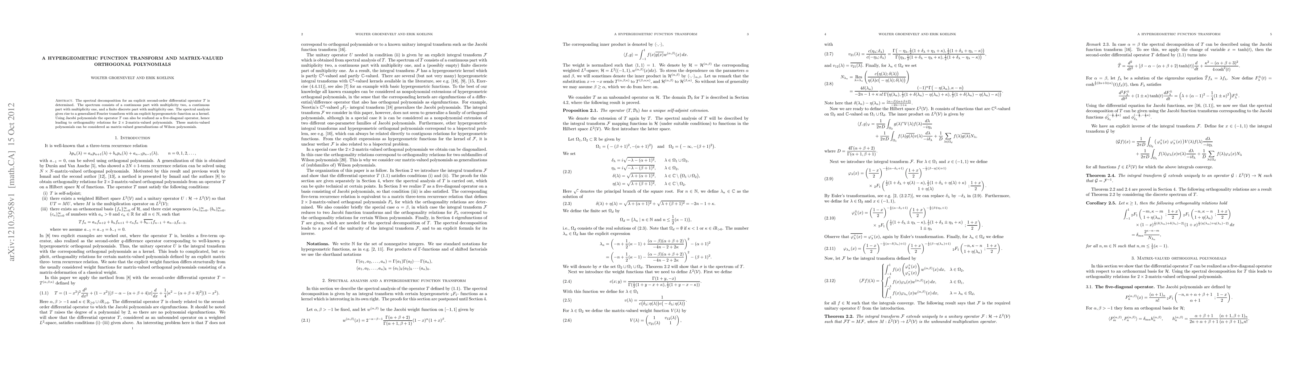 This paper explores the spectral decomposition of a second-order differential operator $T$, revealing a generalized Fourier transform with a hypergeometric function kernel. It also introduces matrix-valued orthogonal polynomials derived from Jacobi polynomials, extending Wilson polynomials into a matrix form.