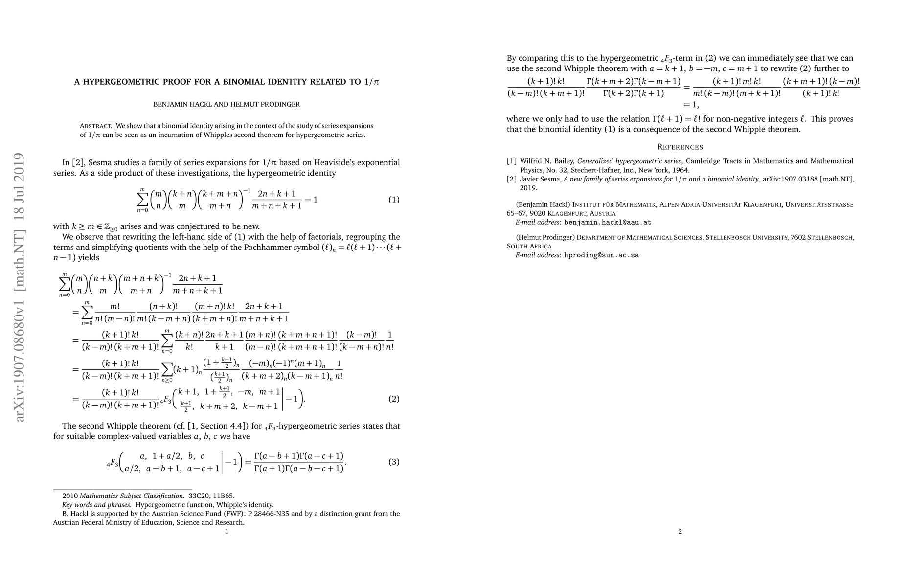 We show that a binomial identity arising in the context of the study of series expansions of $1/\pi$ can be seen as an incarnation of Whipples second theorem for hypergeometric series.