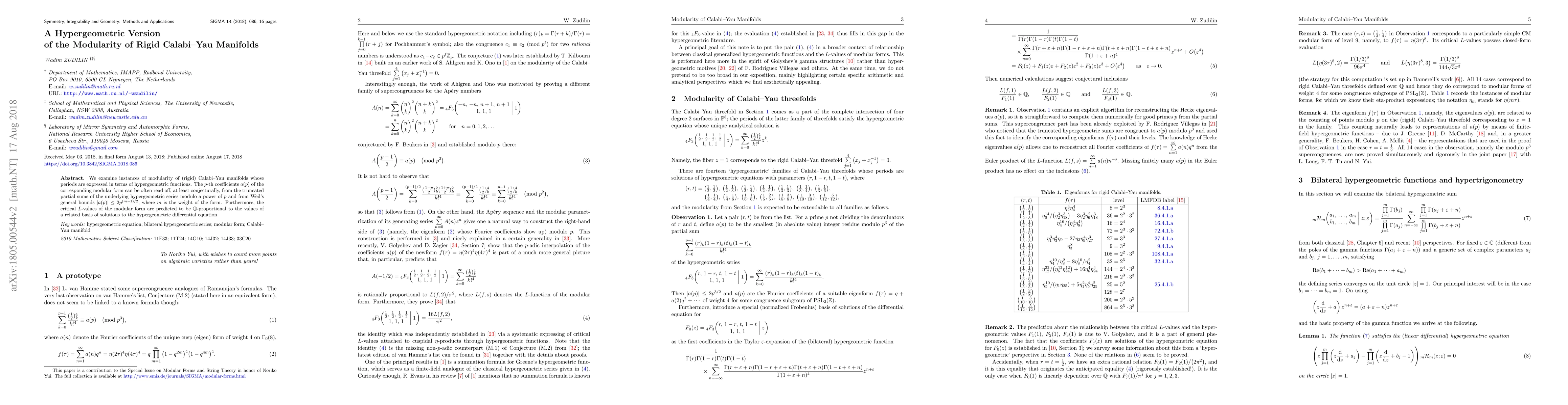 This research explores the modularity of rigid Calabi-Yau manifolds, finding that their period-related modular forms can often be described by hypergeometric functions. The coefficients of these forms can be estimated from truncated hypergeometric series modulo a power of p, adhering to Weil's bounds. The critical L-values of these forms are theorized to correlate with values of a connected hypergeometric basis, offering new insights into string compactification.