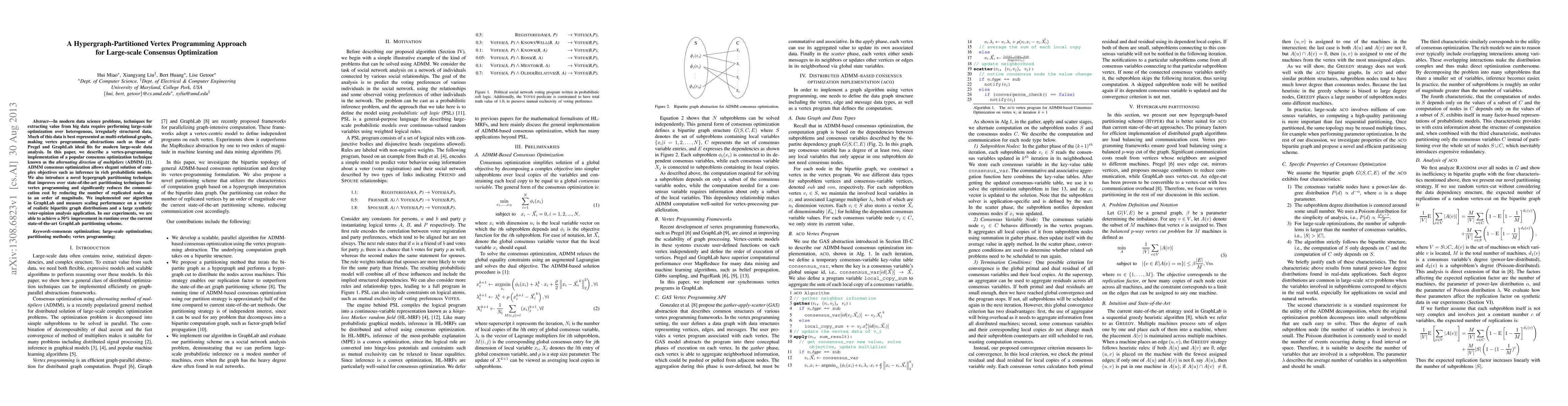 In modern data science problems, techniques for extracting value from big data require performing large-scale optimization over heterogenous, irregularly structured data. Much of this data is best represented as multi-relational graphs, making vertex programming abstractions such as those of Pregel and GraphLab ideal fits for modern large-scale data analysis. In this paper, we describe a vertex-programming implementation of a popular consensus optimization technique known as the alternating direction of multipliers (ADMM). ADMM consensus optimization allows elegant solution of complex objectives such as inference in rich probabilistic models. We also introduce a novel hypergraph partitioning technique that improves over state-of-the-art partitioning techniques for vertex programming and significantly reduces the communication cost by reducing the number of replicated nodes up to an order of magnitude. We implemented our algorithm in GraphLab and measure scaling performance on a variety of realistic bipartite graph distributions and a large synthetic voter-opinion analysis application. In our experiments, we are able to achieve a 50% improvement in runtime over the current state-of-the-art GraphLab partitioning scheme.