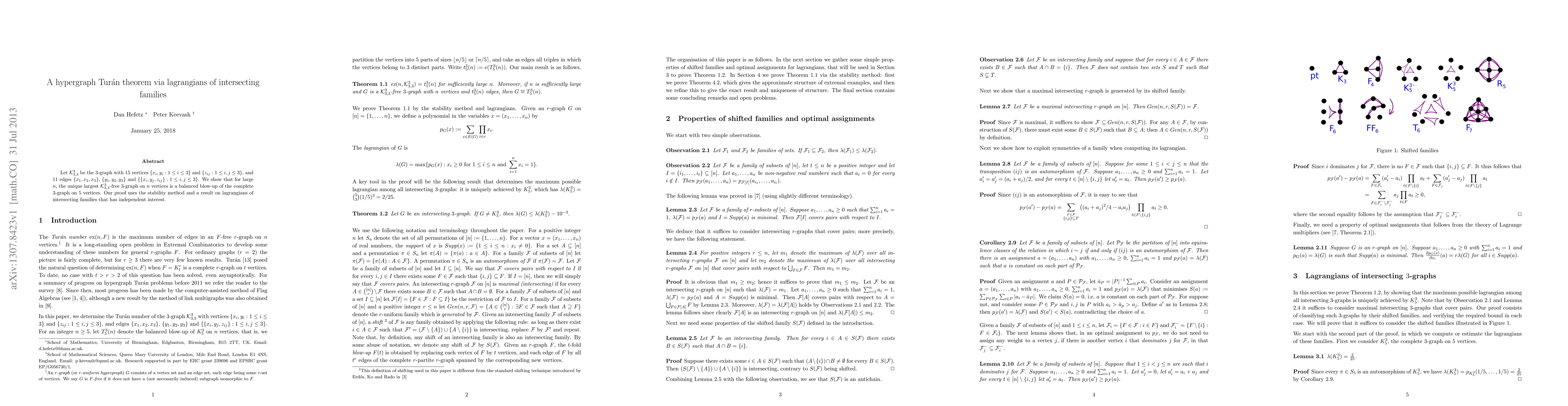 This paper proves that for large numbers of vertices, the largest graph with no edges connecting three specific sets is a modified version of a complete 3-graph on fewer than half as many vertices. The proof uses a new result about 'lagrangians' or families of intersecting graphs.