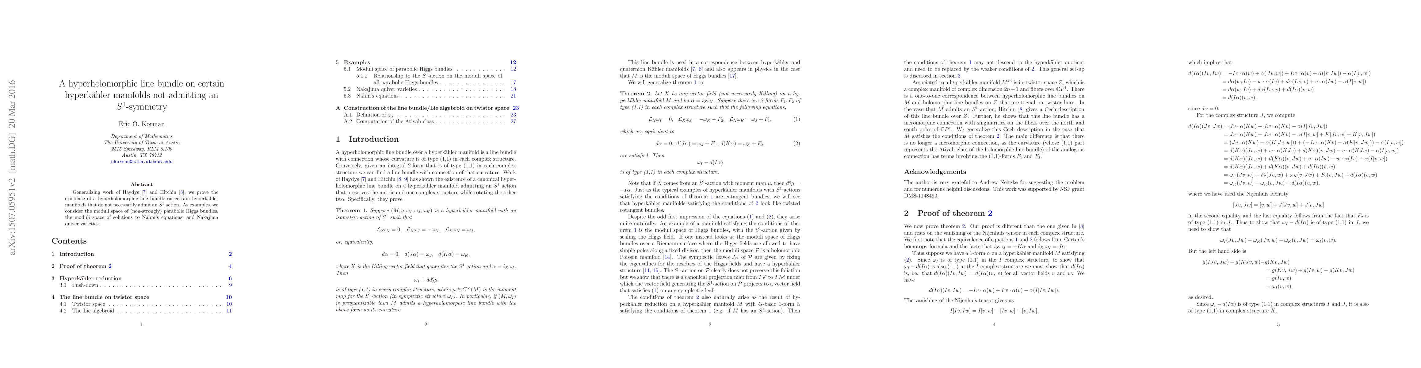 Summary: This paper extends prior work by proving the existence of a hyperholomorphic line bundle on specific hyperkähler manifolds lacking $S^1$ symmetry, with applications to moduli spaces of parabolic Higgs bundles, Nahm's equations, and Nakajima quiver varieties.