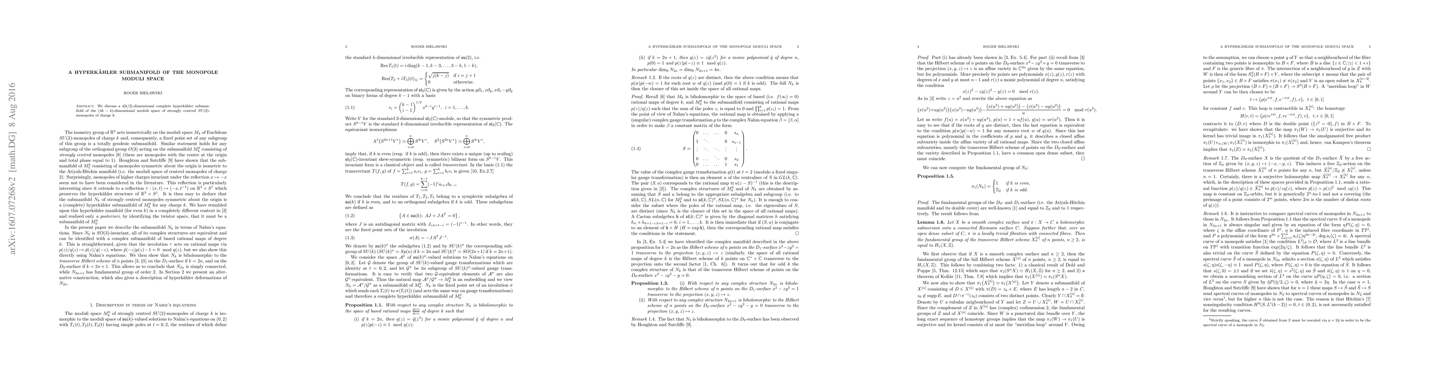 The paper presents a 4[k/2]-dimensional complete hyperkähler submanifold within the (4k-4)-dimensional moduli space of strongly centred SU(2)-monopoles of charge k. This submanifold's structure provides insights into the geometric properties of monopole moduli spaces.