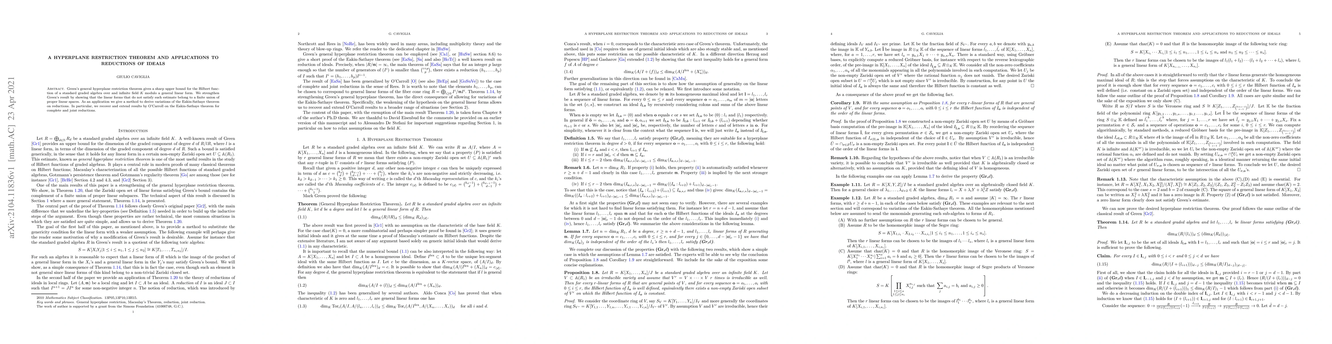 Green's general hyperplane restriction theorem gives a sharp upper bound for the Hilbert function of a standard graded algebra over and infinite field K modulo a general linear form. We strengthen Green's result by showing that the linear forms that do not satisfy such estimate belong to a finite union of proper linear spaces. As an application we give a method to derive variations of the Eakin-Sathaye theorem on reductions. In particular, we recover and extend results by O'Carroll on the Eakin-Sathaye theorem for complete and joint reductions.