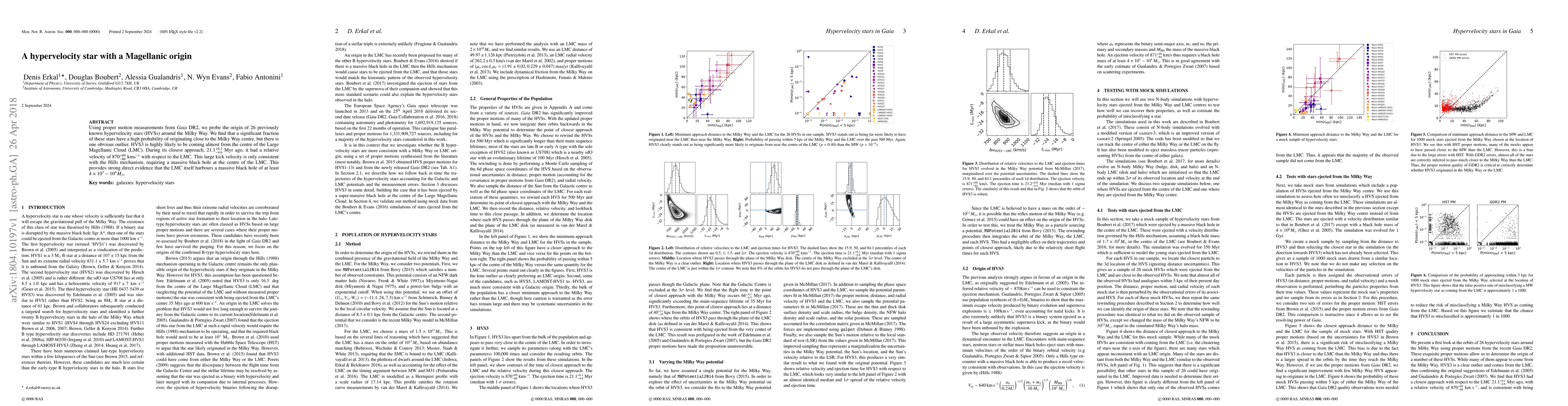 Using proper motion measurements from Gaia DR2, we probe the origin of 26 previously known hypervelocity stars (HVSs) around the Milky Way. We find that a significant fraction of these stars have a high probability of originating close to the Milky Way centre, but there is one obvious outlier. HVS3 is highly likely to be coming almost from the centre of the Large Magellanic Cloud (LMC). During its closest approach, $21.1^{+6.1}_{-4.6}$ Myr ago, it had a relative velocity of $870^{+69}_{-66}$ kms$^{-1}$ with respect to the LMC. This large kick velocity is only consistent with the Hills mechanism, requiring a massive black hole at the centre of the LMC. This provides strong direct evidence that the LMC itself harbours a massive black hole of at least $4\times 10^3 -10^4 M_\odot$.
