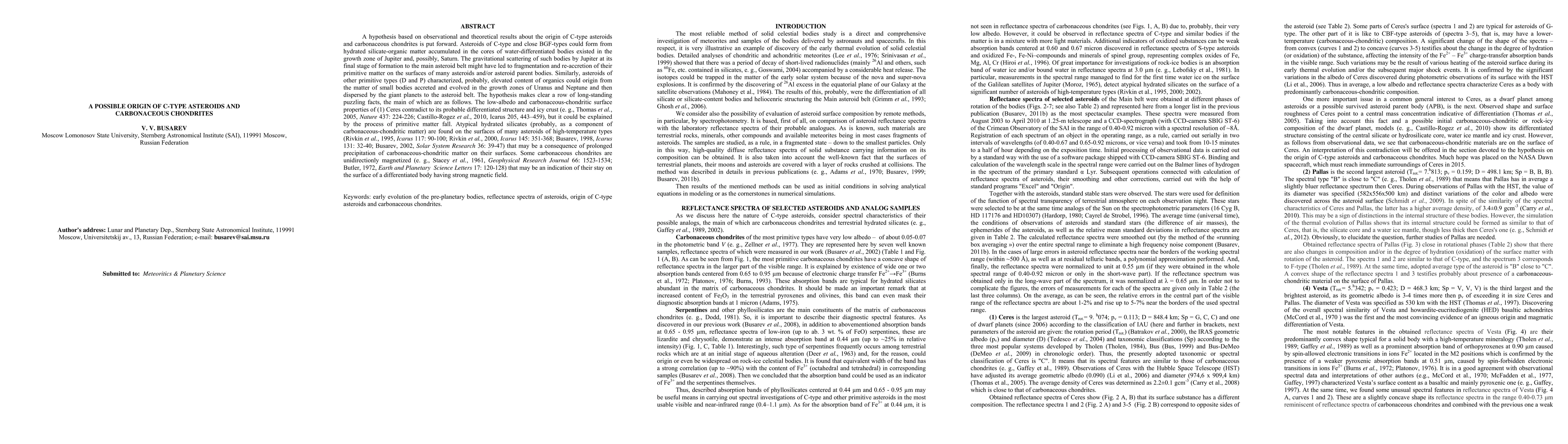 A hypothesis based on observational and theoretical results on the origin of C-type asteroids and carbonaceous chondrites is proposed. Asteroids of C-type and close BGF-types could form from hydrated silicate-organic matter accumulated in the cores of water-differentiated (due to 26Al and other short-lived isotopes decay) bodies existed in the growth zones of Jupiter. Gravitational scattering of such bodies by Jupiter at its final stage of formation to the main asteroid belt might have led to fragmentation and re-accretion of their primitive materials on the surfaces of many asteroids and/or asteroid parent bodies. The hypothesis makes clear a row of long-standing puzzling facts, the main of which are as follows. The low-albedo and carbonaceous-chondritic surface properties of (1) Ceres contradict to its probable differentiated structure and icy crust (e. g., Thomas et al., 2005, Nature 437: 224-226; Castillo-Rogez et al., 2010, Icarus 205, 443-459), but it could be explained by the process of primitive matter fall. Atypical hydrated silicates (probably, as a component of carbonaceous-chondritic matter) are found on the surfaces of many asteroids of high-temperature types (Rivkin et al., 1995, Icarus 117: 90-100; Rivkin et al., 2000, Icarus 145: 351-368; Busarev, 1998, Icarus 131: 32-40; Busarev, 2002, Solar System Research 36: 39-47) that may be a consequence of the carbonaceous-chondritic matter precipitation on their surfaces. Some carbonaceous chondrites are unidirectionly magnetized (e. g., Stacey et al., 1961, J. Geophys. Res. 66: 1523-1534; Butler, 1972, Earth Planet. Sci. Lett. 17: 120-128) which may be a result of their stay on the surface of an early differentiated asteroid parent body having melted interiors and a strong magnetic field.