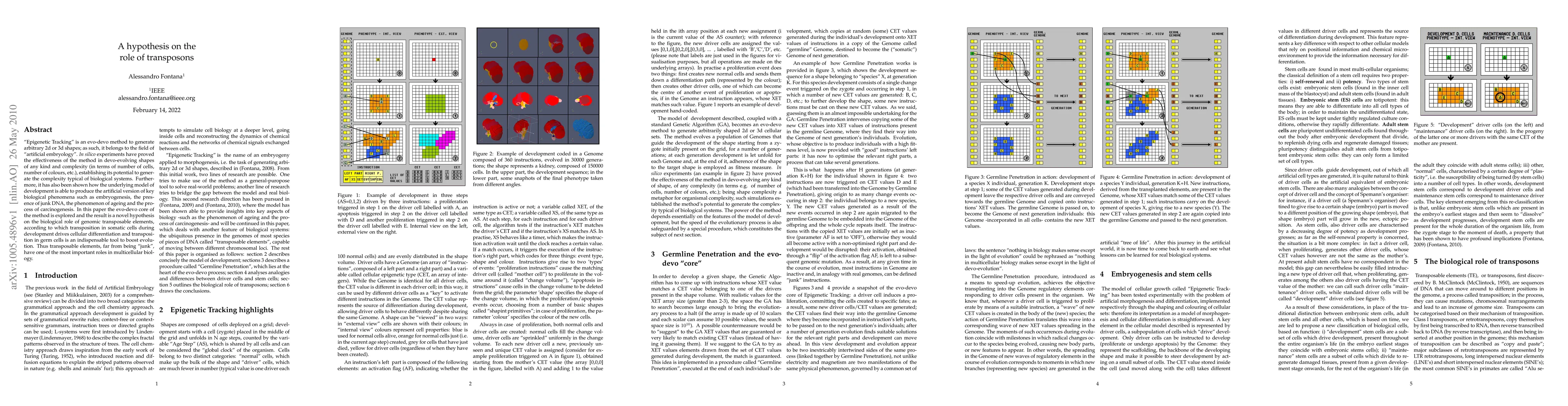 "Epigenetic Tracking" is an evo-devo method to generate arbitrary 2d or 3d shapes; as such, it belongs to the field of "artificial embryology". In silico experiments have proved the effectiveness of the method in devo-evolving shapes of any kind and complexity (in terms of number of cells, number of colours, etc.), establishing its potential to generate the complexity typical of biological systems. Furthermore, it has also been shown how the underlying model of development is able to produce the artificial version of key biological phenomena such as embryogenesis, the presence of junk DNA, the phenomenon of ageing and the process of carcinogenesis. In this paper the evo-devo core of the method is explored and the result is a novel hypothesis on the biological role of genomic transposable elements, according to which transposition in somatic cells during development drives cellular differentiation and transposition in germ cells is an indispensable tool to boost evolution. Thus transposable elements, far from being "junk", have one of the most important roles in multicellular biology.