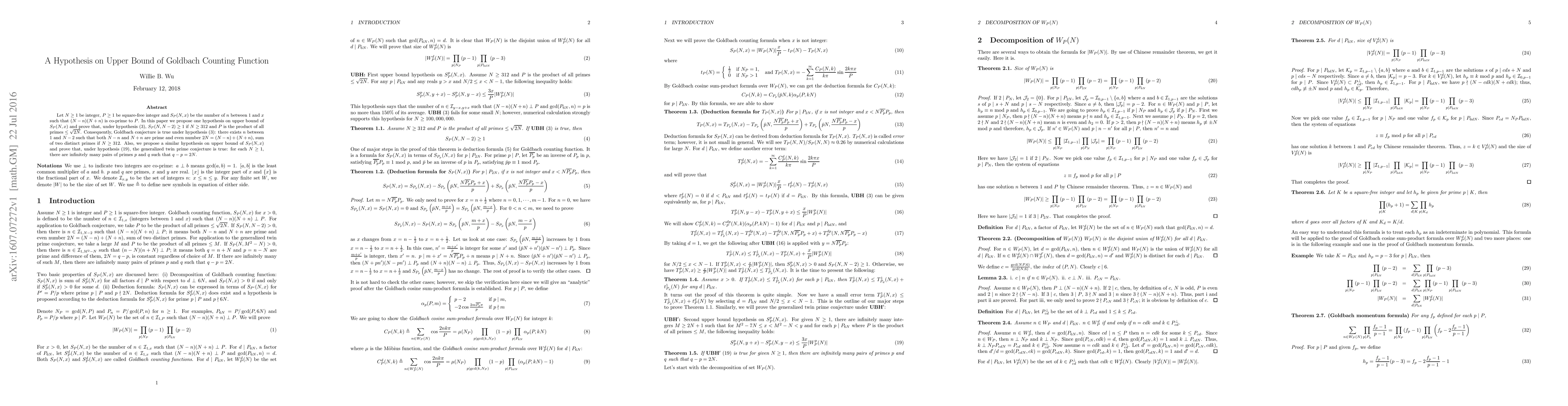 I define Goldbach counting function with N > 0 and square-free P > 0. Decomposition of this function is discovered and deduction formula is found. I propose a hypothesis on upper bound of Goldbach counting function and prove that Goldbach conjecture is true under this hypothesis. Also, I propose a second hypothesis on upper bound of Goldbach counting function and prove that the twin prime conjecture is true under this hypothesis