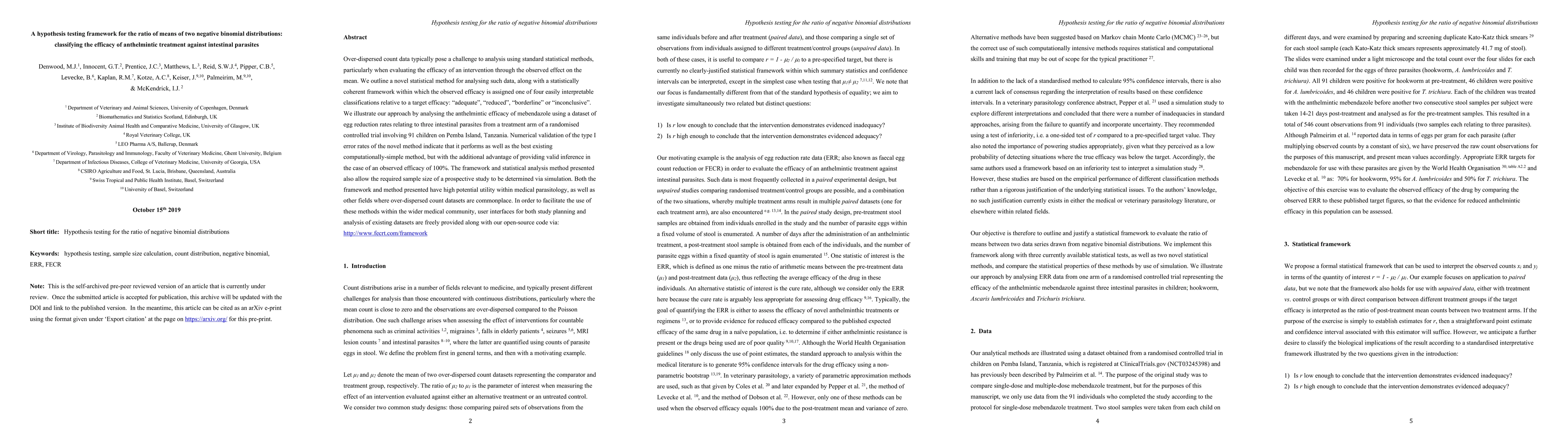 Over-dispersed count data typically pose a challenge to analysis using standard statistical methods, particularly when evaluating the efficacy of an intervention through the observed effect on the mean. We outline a novel statistical method for analysing such data, along with a statistically coherent framework within which the observed efficacy is assigned one of four easily interpretable classifications relative to a target efficacy: "adequate", "reduced", "borderline" or "inconclusive". We illustrate our approach by analysing the anthelmintic efficacy of mebendazole using a dataset of egg reduction rates relating to three intestinal parasites from a treatment arm of a randomised controlled trial involving 91 children on Pemba Island, Tanzania. Numerical validation of the type I error rates of the novel method indicate that it performs as well as the best existing computationally-simple method, but with the additional advantage of providing valid inference in the case of an observed efficacy of 100%. The framework and statistical analysis method presented also allow the required sample size of a prospective study to be determined via simulation. Both the framework and method presented have high potential utility within medical parasitology, as well as other fields where over-dispersed count datasets are commonplace. In order to facilitate the use of these methods within the wider medical community, user interfaces for both study planning and analysis of existing datasets are freely provided along with our open-source code via: http://www.fecrt.com/framework