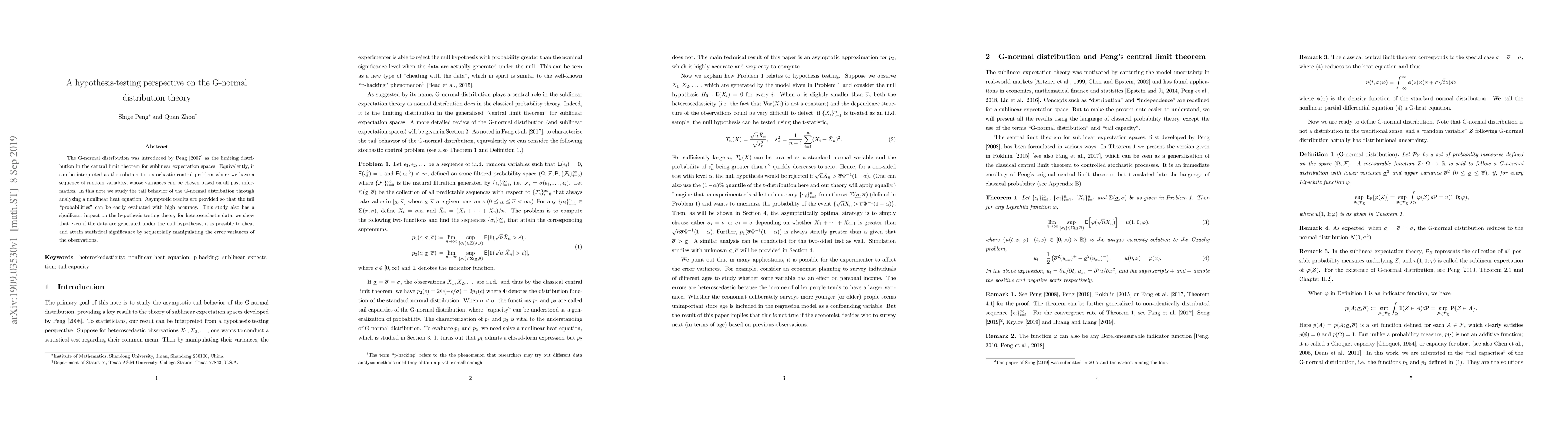 This paper explores the tail behavior of the G-normal distribution via a nonlinear heat equation, providing asymptotic results for high-accuracy tail probability evaluation. It also reveals implications for hypothesis testing in heteroscedastic data, showing potential manipulation of error variances to achieve statistical significance.