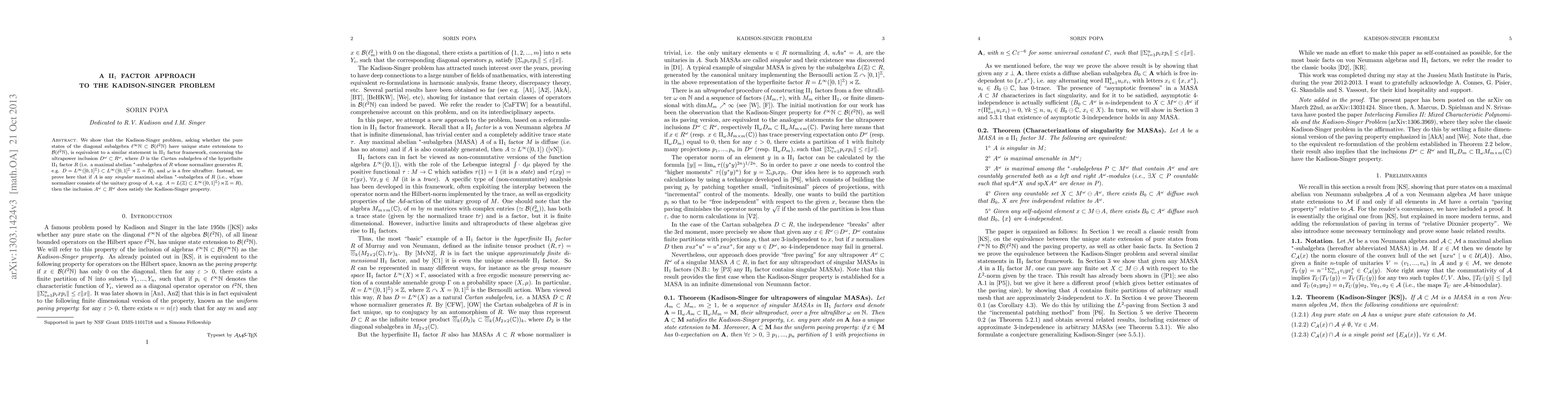 This paper demonstrates the equivalence between the Kadison-Singer problem in operator algebras and a similar problem in the context of II$_1$ factors, specifically regarding the ultrapower inclusion $D^\omega \subset R^\omega$. It concludes that any singular maximal abelian subalgebra $A$ of $R$ satisfies the Kadison-Singer property in its ultrapower inclusion $A^\omega \subset R^\omega$.