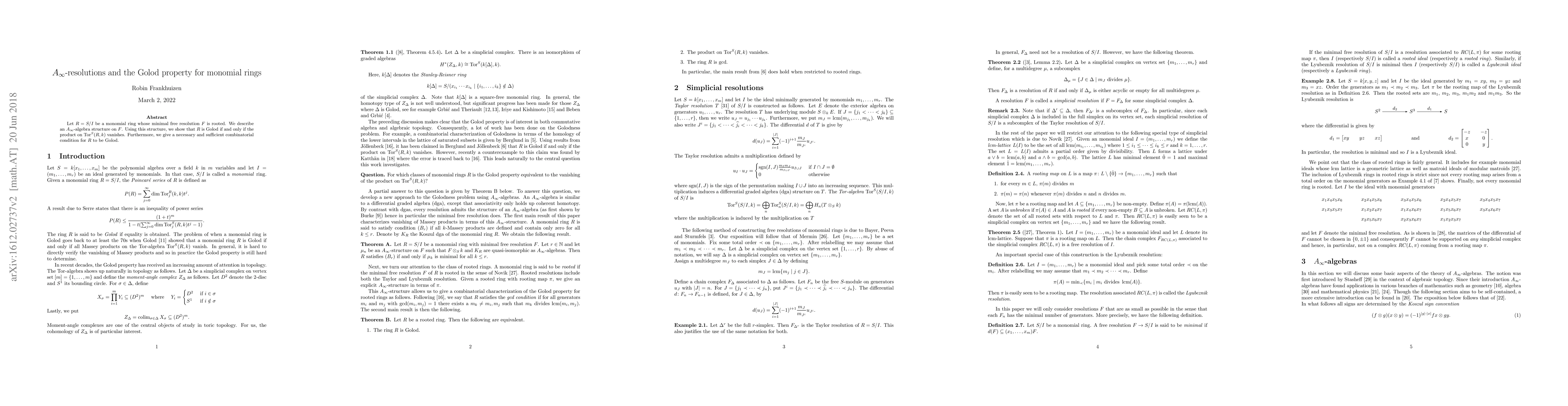 Let R=S/I be a monomial ring whose minimal free resolution F is rooted. We describe an A-infinity algebra structure on F. Using this structure, we show that R is Golod if and only if the product on Tor^S(R,k) vanishes. Furthermore, we give a necessary and sufficient combinatorial condition for R to be Golod.