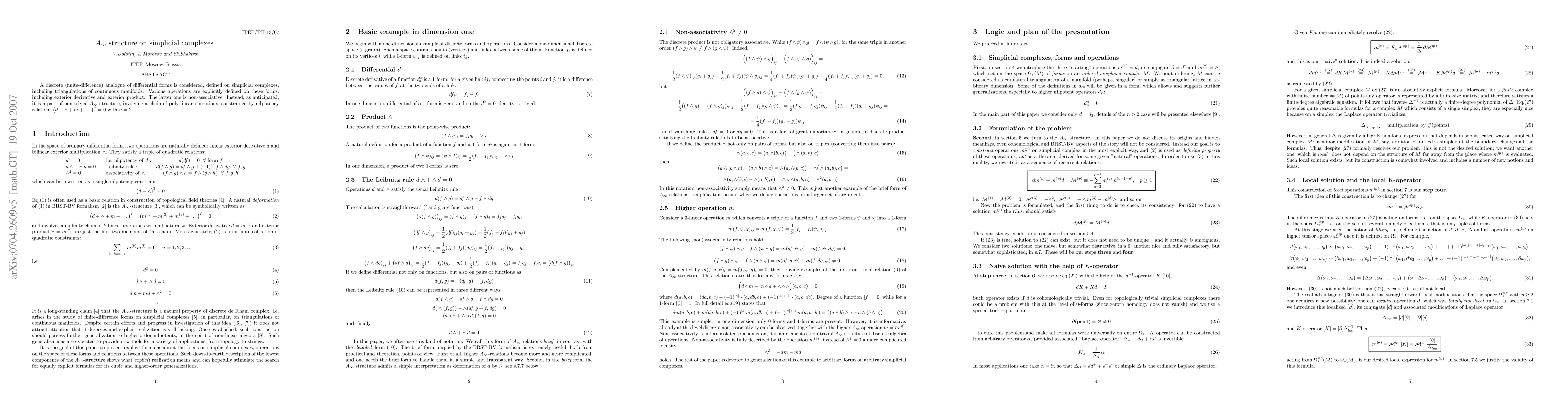 This paper introduces a discrete analogue of differential forms on simplicial complexes, including operations like exterior derivative and non-associative exterior product. The exterior product is part of a non-trivial A-infinity structure characterized by a series of poly-linear operations subject to a nilpotency condition.