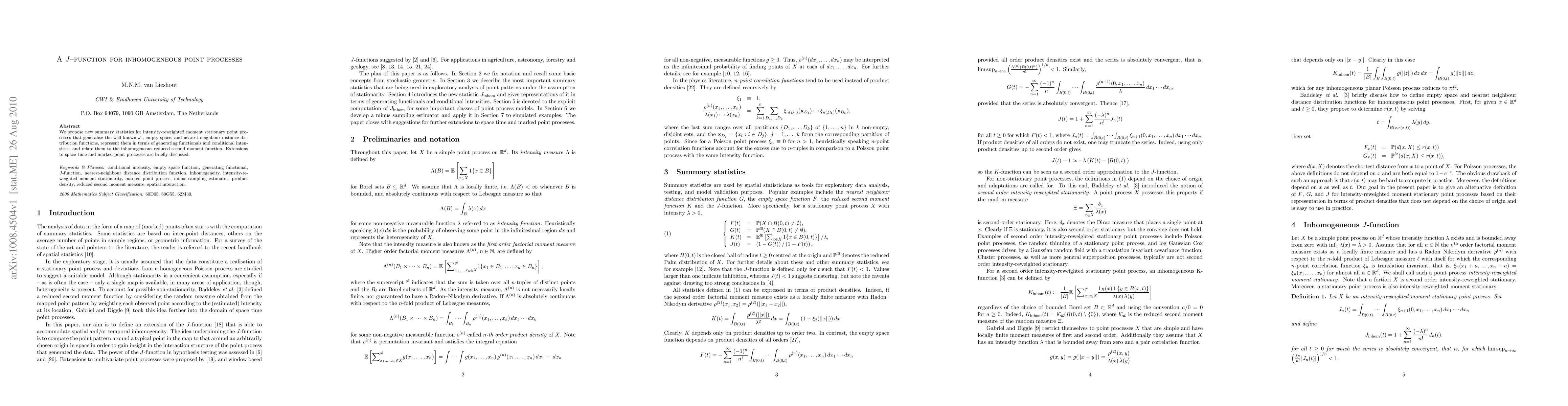 This paper introduces new summary statistics for intensity-reweighted moment stationary point processes, generalizing existing J-, empty space, and nearest-neighbour distance functions, and relates them to the inhomogeneous reduced second moment function. Extensions to space-time and marked point processes are also briefly considered.