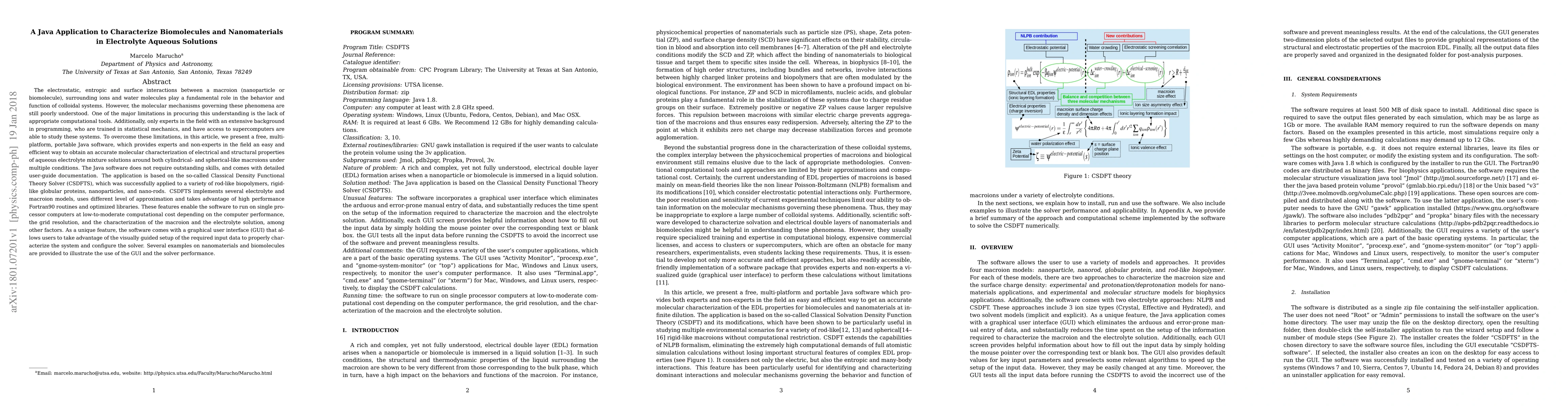 The electrostatic, entropic and surface interactions between a macroion (nanoparticle or biomolecule), surrounding ions and water molecules play a fundamental role in the behavior and function of colloidal systems. However, the molecular mechanisms governing these phenomena are still poorly understood. In this article, we present a free, multi-platform, portable Java software, which provides experts and non-experts in the field an easy and efficient way to obtain an accurate molecular characterization of electrical and structural properties of aqueous electrolyte mixture solutions around both cylindrical- and spherical-like macroions under multiple conditions. The Java software does not require outstanding skills, and comes with detailed user-guide documentation. The application is based on the so-called Classical Density Functional Theory Solver (CSDFTS), which was successfully applied to a variety of rod-like biopolymers, rigid-like globular proteins, nanoparticles, and nano-rods. CSDFTS implements several electrolyte and macroion models, uses different level of approximation and takes advantage of high performance Fortran90 routines and optimized libraries. These features enable the software to run on single processor computers at low-to-moderate computational cost depending on the computer performance, the grid resolution, and the characterization of the macroion and the electrolyte solution, among other factors. As a unique feature, the software comes with a graphical user interface (GUI) that allows users to take advantage of the visually guided setup of the required input data to properly characterize the system and configure the solver. Several examples on nanomaterials and biomolecules are provided to illustrate the use of the GUI and the solver performance.
