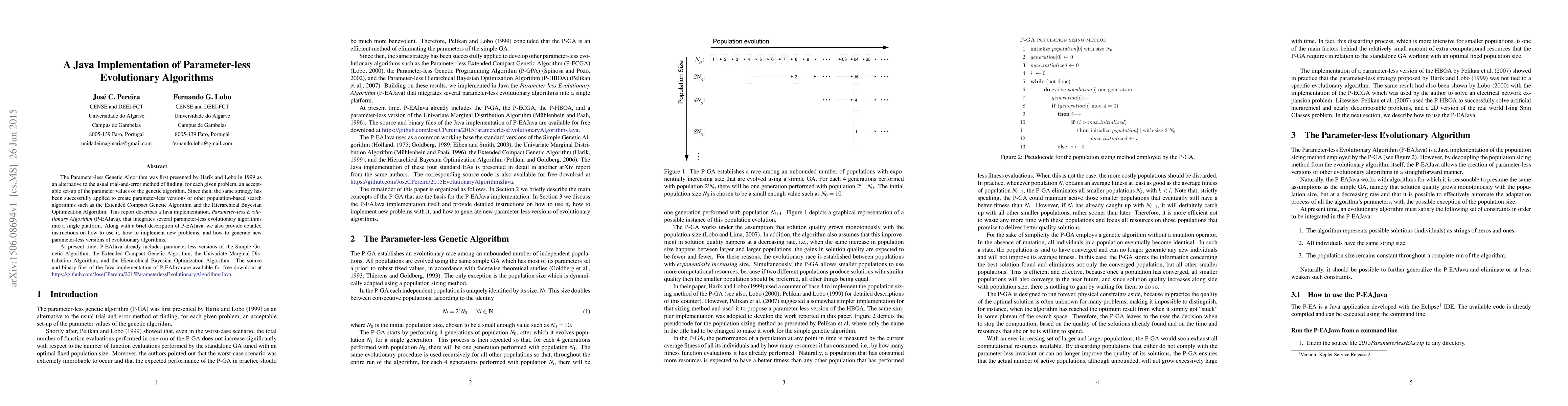 This paper presents P-EAJava, a Java implementation of parameter-less evolutionary algorithms, integrating various algorithms like the Simple Genetic Algorithm and the Hierarchical Bayesian Optimization Algorithm into a single platform. It provides detailed usage instructions and is available for free download.