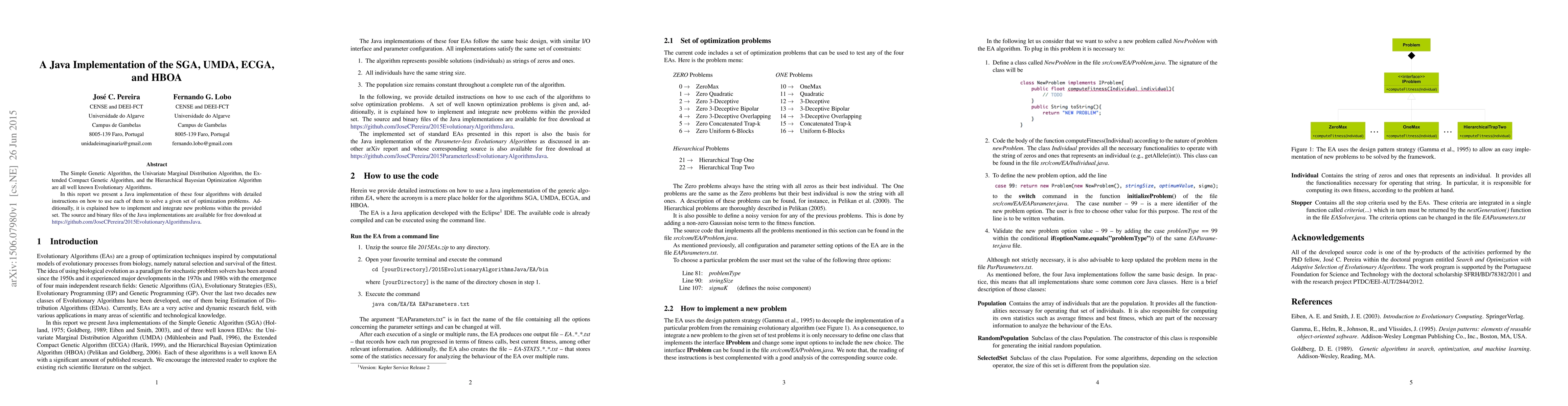 This paper presents a Java implementation of four prominent Evolutionary Algorithms: SGA, UMDA, ECGA, and HBOA. It provides detailed usage instructions for each algorithm to tackle optimization problems and explains how to integrate new problems into the framework. Source and binary files are available for free download on GitHub.