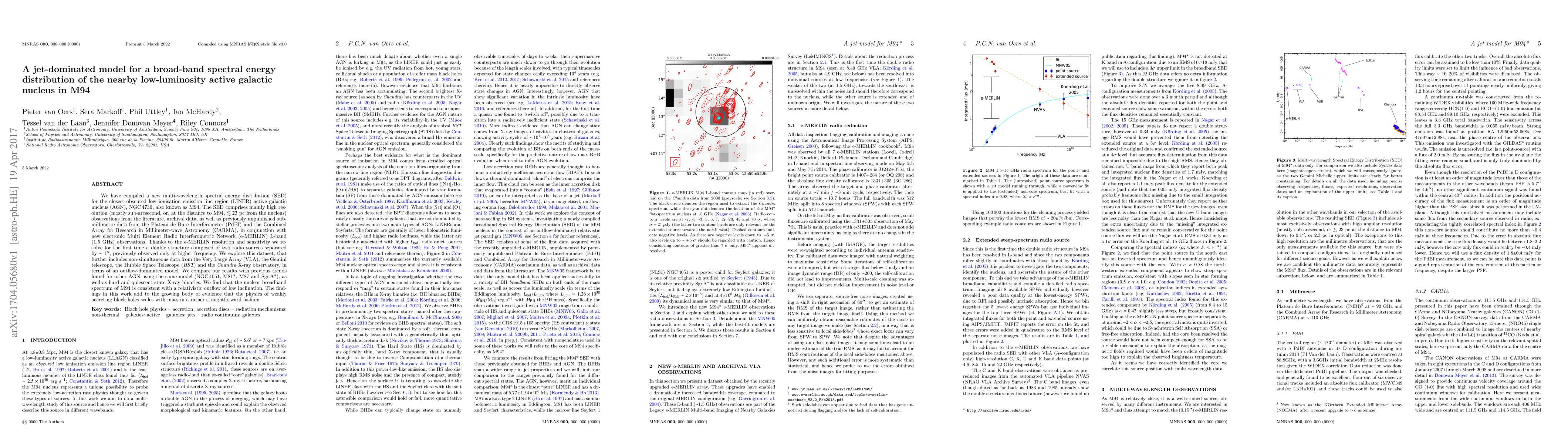 This paper compiles a multiwavelength spectral energy distribution of the nearby low-luminosity AGN M94, revealing a double radio structure with high-resolution e-MERLIN observations. The study supports a jet-dominated model for the broad-band spectrum, consistent with relativistic outflow characteristics, suggesting a uniform scaling of weakly accreting black holes across different masses.