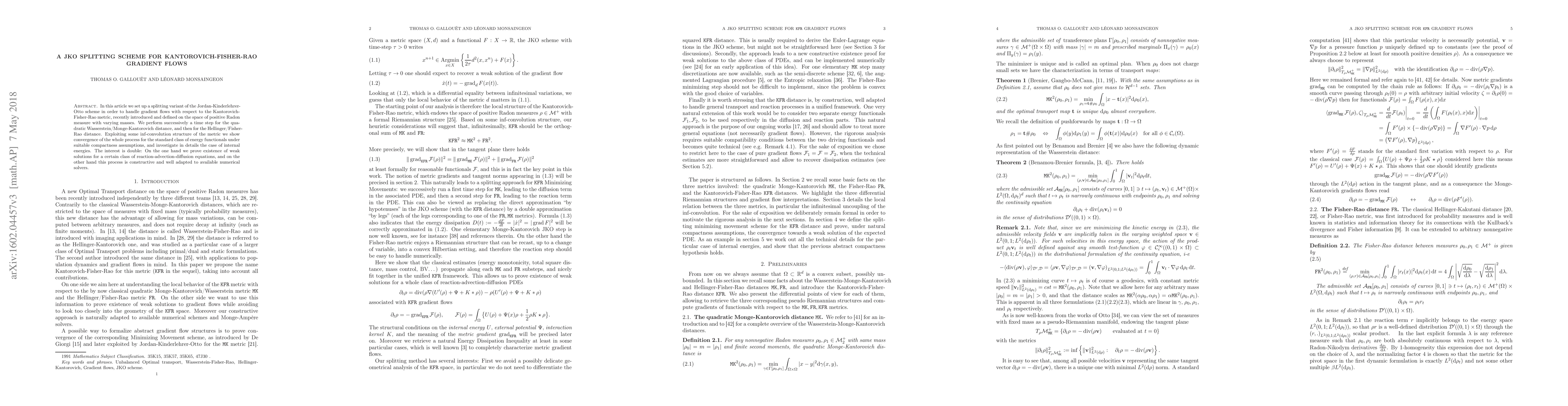 This paper develops a JKO splitting scheme to manage gradient flows in the Kantorovich-Fisher-Rao metric, combining Wasserstein and Hellinger distances. It proves convergence and existence of weak solutions for reaction-advection-diffusion equations, providing a constructive approach suitable for numerical solvers.