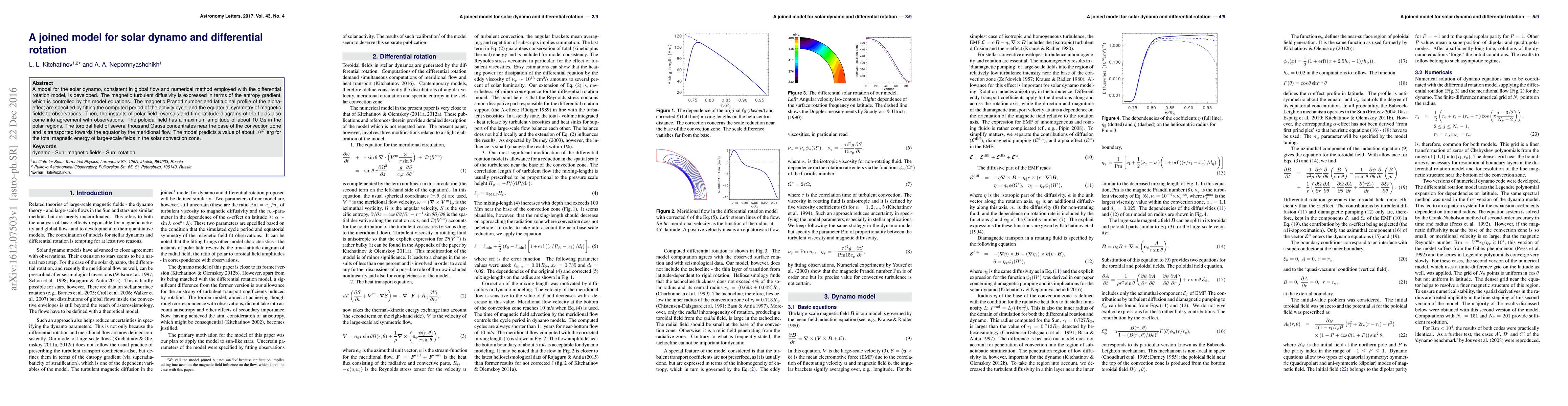A model for the solar dynamo, consistent in global flow and numerical method employed with the differential rotation model, is developed. The magnetic turbulent diffusivity is expressed in terms of the entropy gradient, which is controlled by the model equations. The magnetic Prandtl number and latitudinal profile of the alpha-effect are specified by fitting the computed period of the activity cycle and the equatorial symmetry of magnetic fields to observations. Then, the instants of polar field reversals and time-latitude diagrams of the fields also come into agreement with observations. The poloidal field has a maximum amplitude of about 10 Gs in the polar regions. The toroidal field of several thousand Gauss concentrates near the base of the convection zone and is transported towards the equator by the meridional flow. The model predicts a value of about 10^37 erg for the total magnetic energy of large-scale fields in the solar convection zone.