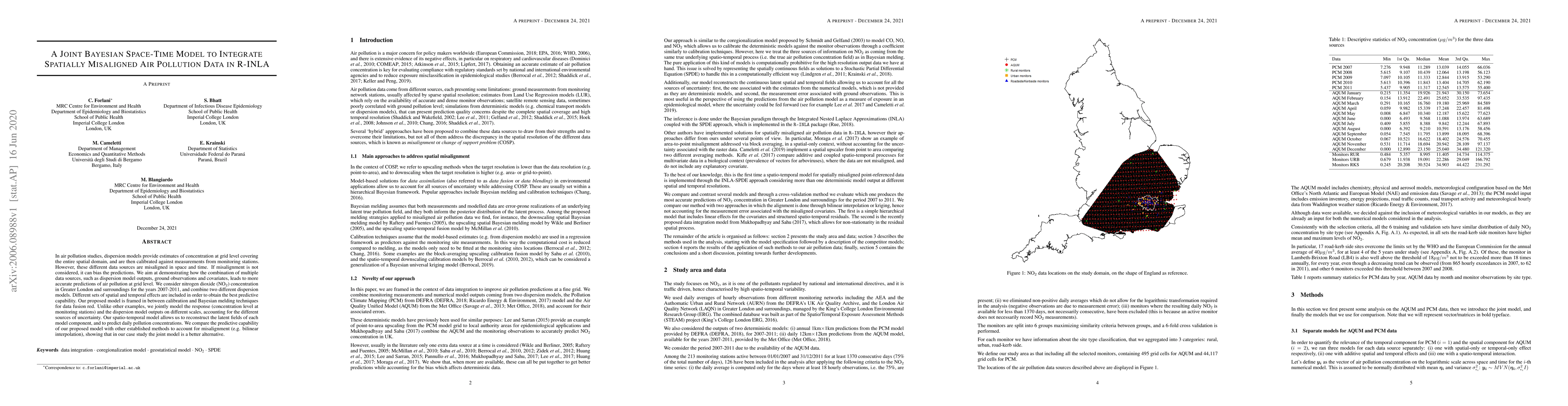 This paper proposes a joint Bayesian space-time model using R-INLA to integrate misaligned air pollution data sources, demonstrating improved predictions of nitrogen dioxide (NO2) concentrations in Greater London. The model combines dispersion model outputs, ground observations, and covariates, showing superior predictive capability compared to traditional methods.