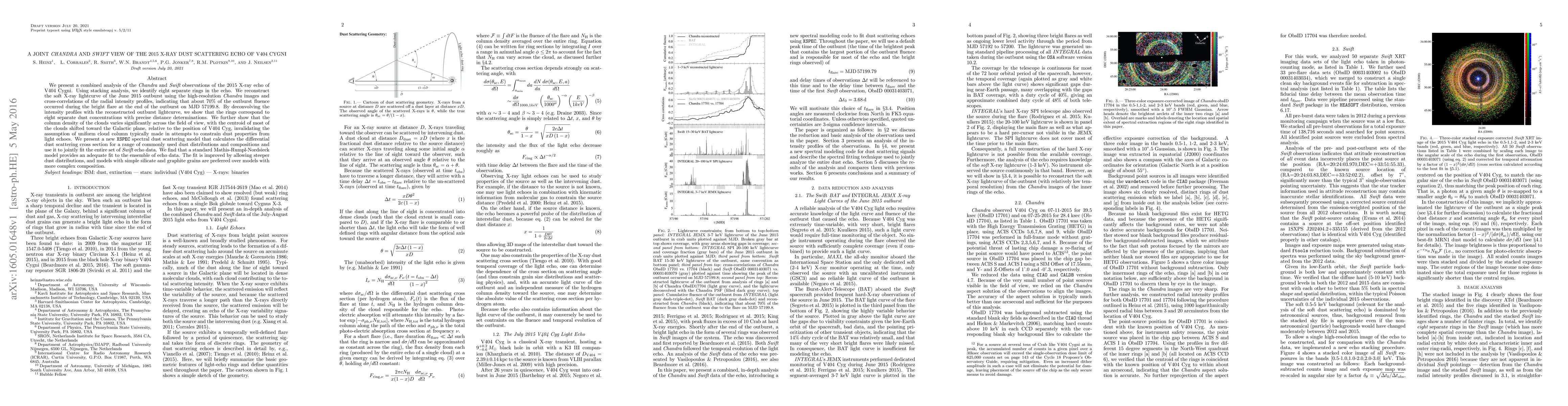 This paper combines Chandra and Swift observations to analyze the 2015 X-ray dust scattering echo of V404 Cygni, revealing eight distinct rings corresponding to separate dust concentrations. The study finds significant variations in cloud column density and invalidates the assumption of uniform cloud column, favoring simpler dust models with silicate and graphite grains.
