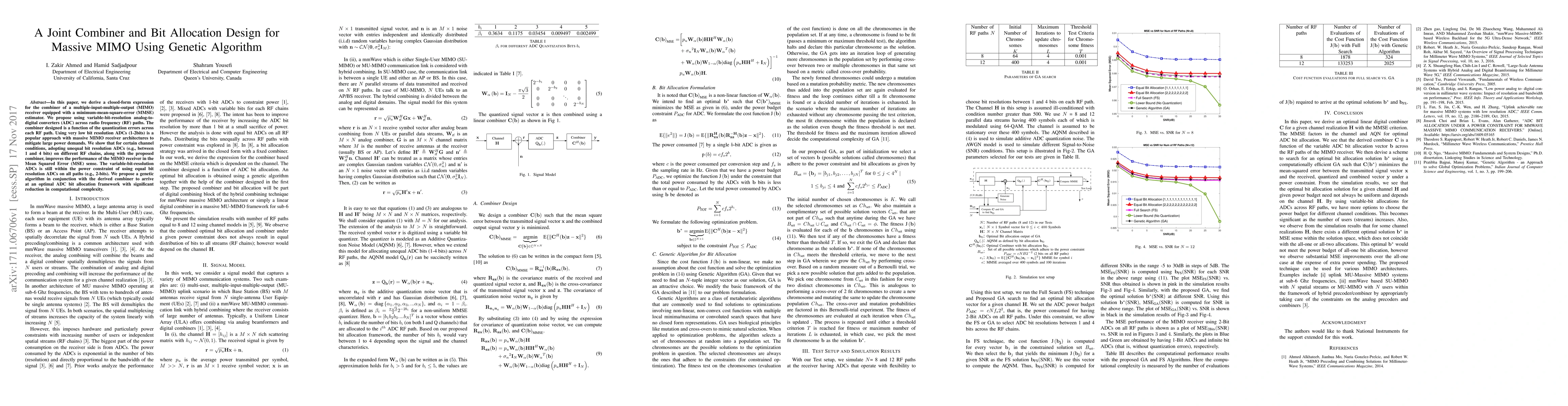 This paper proposes a combiner design for massive MIMO receivers using low-bit resolution ADCs and a genetic algorithm for optimal bit allocation, showing improved performance in MSE while maintaining power constraints. The genetic algorithm reduces computational complexity in determining the best bit allocation strategy.