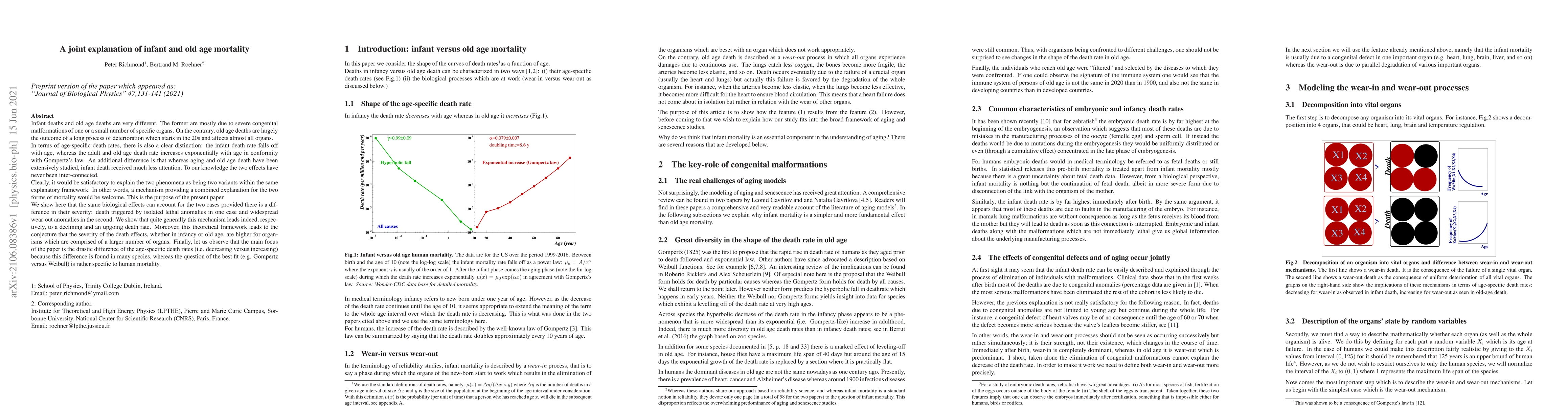 Infant deaths and old age deaths are very different. The former are mostly due to severe congenital malformations of one or a small number of specific organs. On the contrary, old age deaths are largely the outcome of a long process of deterioration which starts in the 20s and affects almost all organs. In terms of age-specific death rates, there is also a clear distinction: the infant death rate falls off with age, whereas the adult and old age death rate increases exponentially with age in conformity with Gompertz's law. Clearly, it would be satisfactory to explain the two phenomena as being two variants within the same explanatory framework. In other words, a mechanism providing a combined explanation for the two forms of mortality would be welcome. This is the purpose of the present paper. We show here that the same biological effects can account for the two cases provided there is a difference in their severity: death triggered by isolated lethal anomalies in one case and widespread wear-out anomalies in the second. We show that quite generally this mechanism leads indeed, respectively, to a declining and an upgoing death rate. Moreover, this theoretical framework leads to the conjecture that the severity of the death effects, whether in infancy or old age, are higher for organisms which are comprised of a larger number of organs. Finally, let us observe that the main focus of the paper is the drastic difference of the age-specific death rates (i.e. decreasing versus increasing) because this difference is found in many species, whereas the question of the best fit (e.g. Gompertz versus Weibull) is rather specific to human mortality.