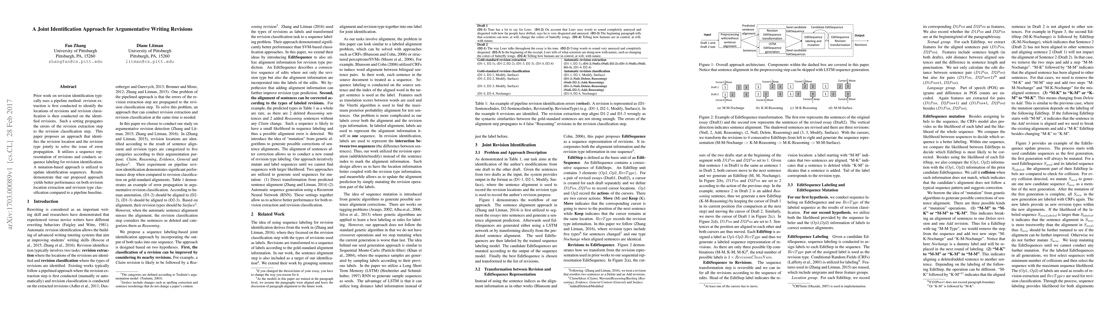 Prior work on revision identification typically uses a pipeline method: revision extraction is first conducted to identify the locations of revisions and revision classification is then conducted on the identified revisions. Such a setting propagates the errors of the revision extraction step to the revision classification step. This paper proposes an approach that identifies the revision location and the revision type jointly to solve the issue of error propagation. It utilizes a sequence representation of revisions and conducts sequence labeling for revision identification. A mutation-based approach is utilized to update identification sequences. Results demonstrate that our proposed approach yields better performance on both revision location extraction and revision type classification compared to a pipeline baseline.