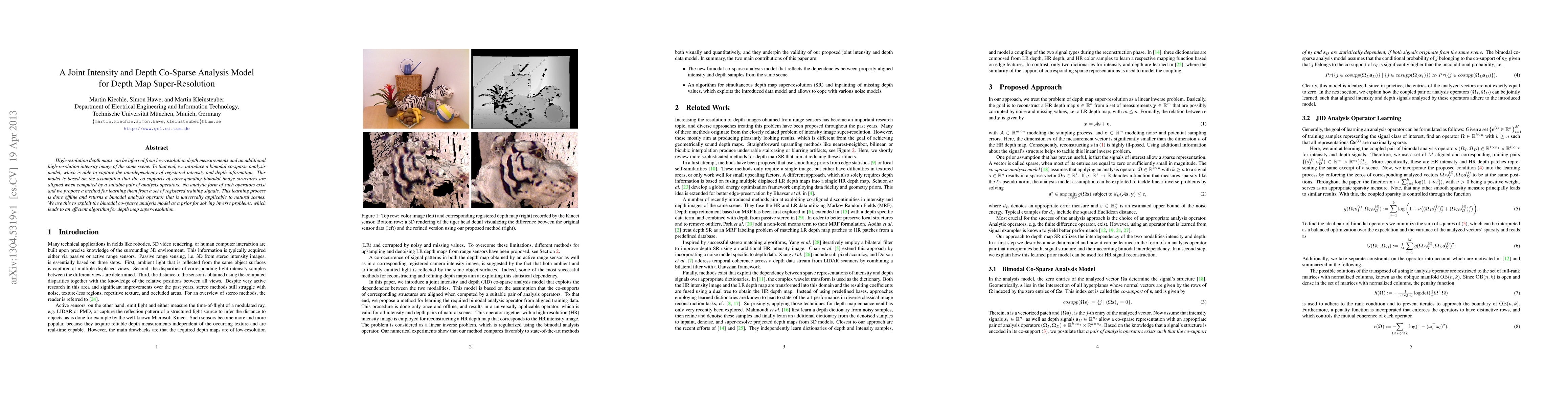 This paper proposes a joint intensity and depth co-sparse analysis model for depth map super-resolution, leveraging the interdependency of intensity and depth information. The model learns bimodal analysis operators from training data to infer high-resolution depth maps from low-resolution inputs, enhancing depth map resolution efficiently.