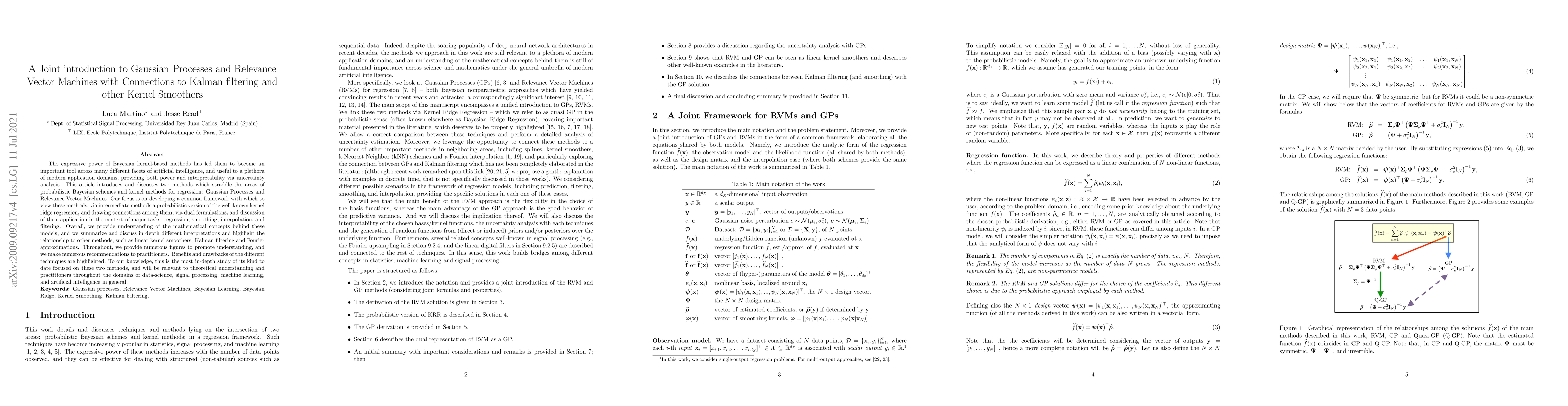 The expressive power of Bayesian kernel-based methods has led them to become an important tool across many different facets of artificial intelligence, and useful to a plethora of modern application domains, providing both power and interpretability via uncertainty analysis. This article introduces and discusses two methods which straddle the areas of probabilistic Bayesian schemes and kernel methods for regression: Gaussian Processes and Relevance Vector Machines. Our focus is on developing a common framework with which to view these methods, via intermediate methods a probabilistic version of the well-known kernel ridge regression, and drawing connections among them, via dual formulations, and discussion of their application in the context of major tasks: regression, smoothing, interpolation, and filtering. Overall, we provide understanding of the mathematical concepts behind these models, and we summarize and discuss in depth different interpretations and highlight the relationship to other methods, such as linear kernel smoothers, Kalman filtering and Fourier approximations. Throughout, we provide numerous figures to promote understanding, and we make numerous recommendations to practitioners. Benefits and drawbacks of the different techniques are highlighted. To our knowledge, this is the most in-depth study of its kind to date focused on these two methods, and will be relevant to theoretical understanding and practitioners throughout the domains of data-science, signal processing, machine learning, and artificial intelligence in general.