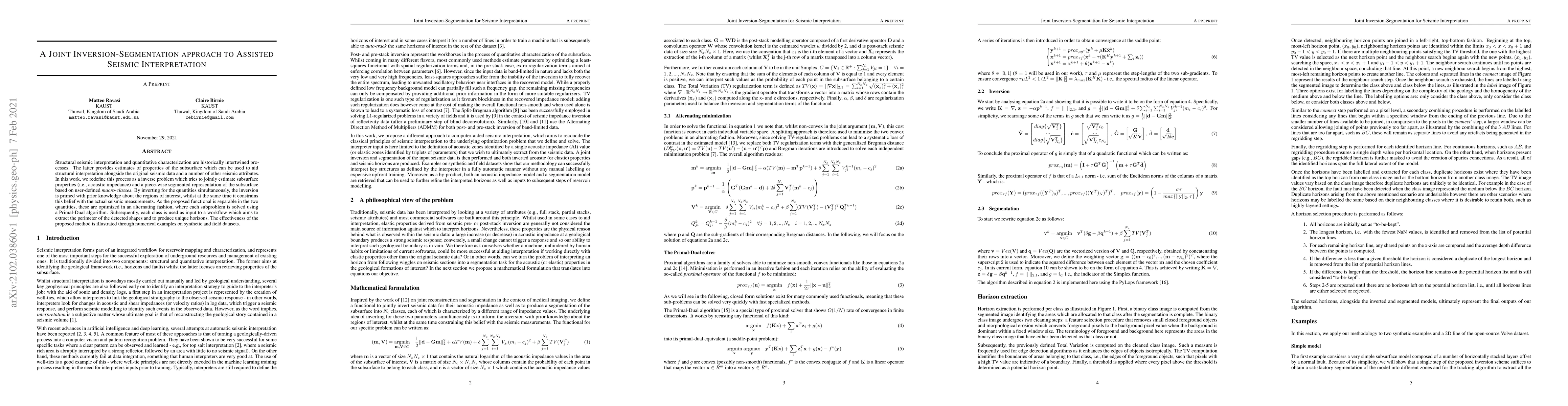 This paper proposes a joint inversion-segmentation approach for assisted seismic interpretation, aiming to simultaneously estimate subsurface properties and segment the subsurface into user-defined macro-classes. The method alternates between solving subproblems using a Primal-Dual algorithm, demonstrating effectiveness on both synthetic and field datasets.