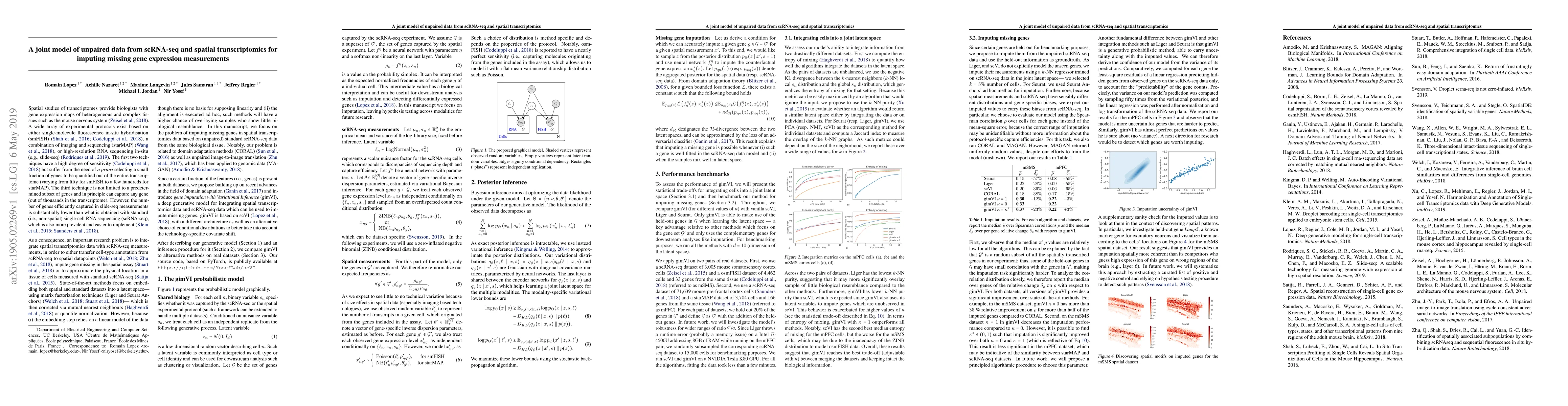 This paper proposes gimVI, a deep generative model that integrates unpaired scRNA-seq and spatial transcriptomics data to impute missing gene expression measurements in spatial transcriptomics. The method outperforms existing alternatives like Seurat Anchors, Liger, and CORAL in imputing held-out genes.