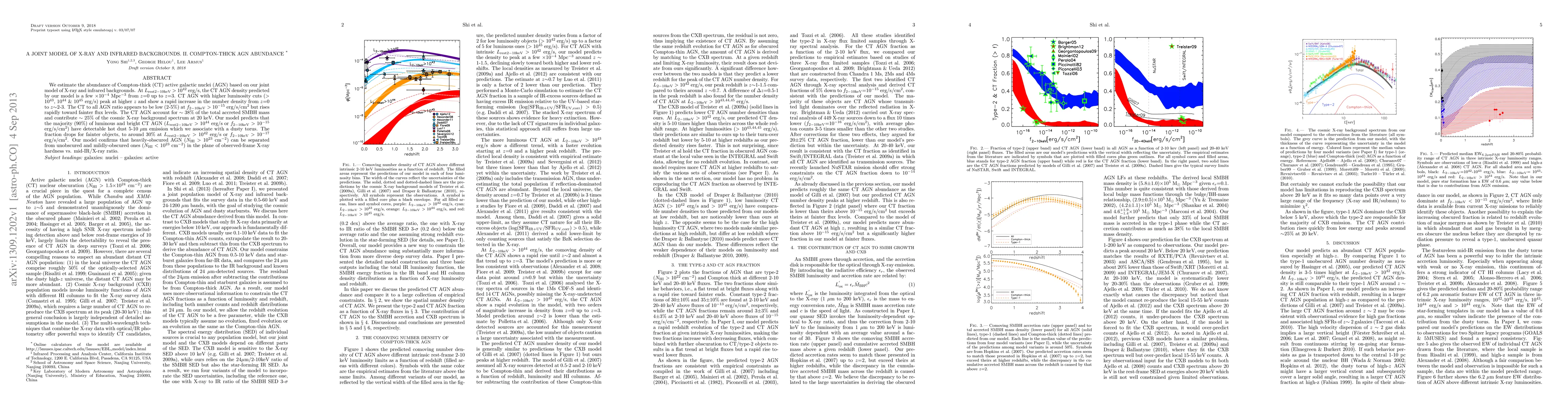 This paper estimates the abundance of Compton-thick active galactic nuclei (CT AGN) using a joint X-ray and infrared background model, finding that CT AGN density peaks at higher redshifts for higher luminosities and accounts for ~38% of total accreted supermassive black hole mass. The model also predicts that most luminous CT AGN exhibit detectable hot dust emission.