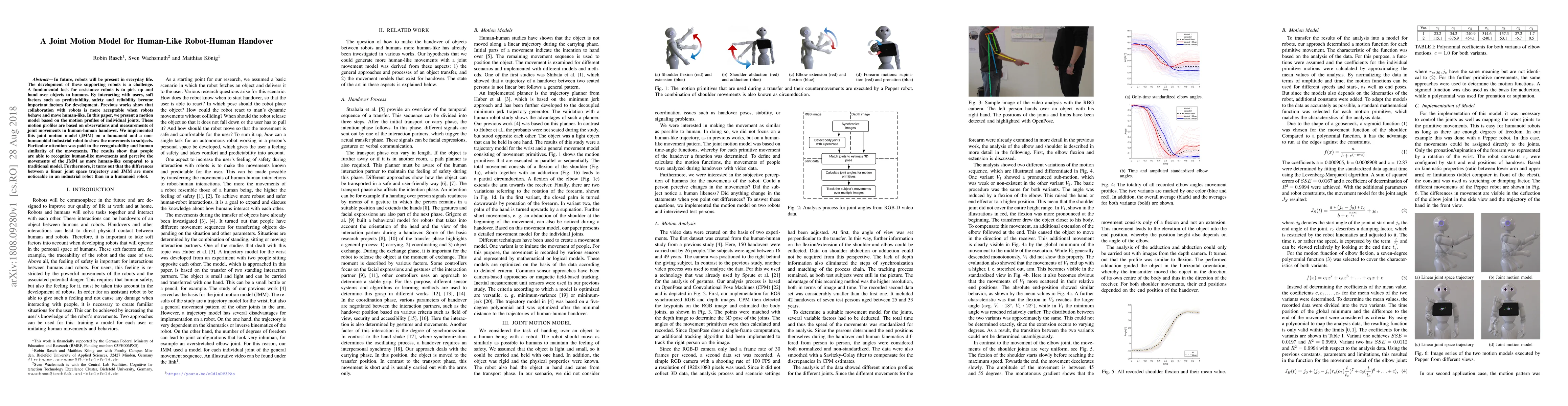 In future, robots will be present in everyday life. The development of these supporting robots is a challenge. A fundamental task for assistance robots is to pick up and hand over objects to humans. By interacting with users, soft factors such as predictability, safety and reliability become important factors for development. Previous works show that collaboration with robots is more acceptable when robots behave and move human-like. In this paper, we present a motion model based on the motion profiles of individual joints. These motion profiles are based on observations and measurements of joint movements in human-human handover. We implemented this joint motion model (JMM) on a humanoid and a non-humanoidal industrial robot to show the movements to subjects. Particular attention was paid to the recognizability and human similarity of the movements. The results show that people are able to recognize human-like movements and perceive the movements of the JMM as more human-like compared to a traditional model. Furthermore, it turns out that the differences between a linear joint space trajectory and JMM are more noticeable in an industrial robot than in a humanoid robot.